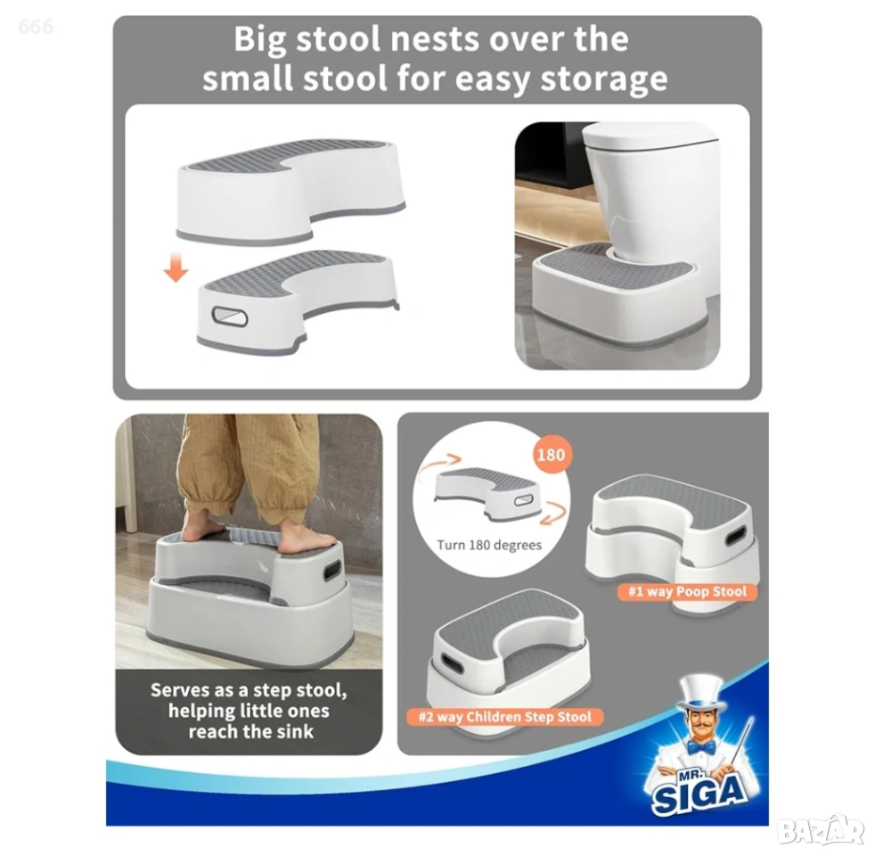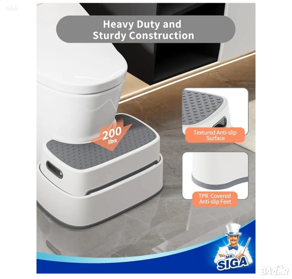 БЕЗОПАСНО И ИЗДРЪЖЛИВО: Горната и долната част на тоалетната табуретка MR.SIGA са изработени от неплъзгащ се TPR, за да осигурят безопасността на потребителите и са подходящи за различни повърхности. Останалата бяла част на стъпалото за тоалетна е изработена от PP с гладки ръбове, които няма да наранят децата. Материалът е висококачествен, издръжлив и безопасен за деца и възрастни.