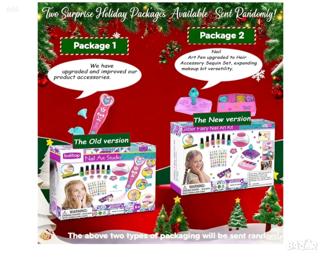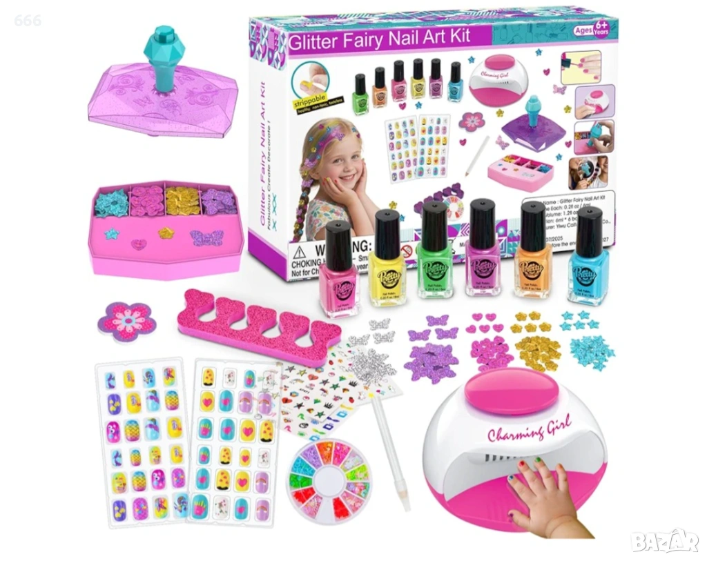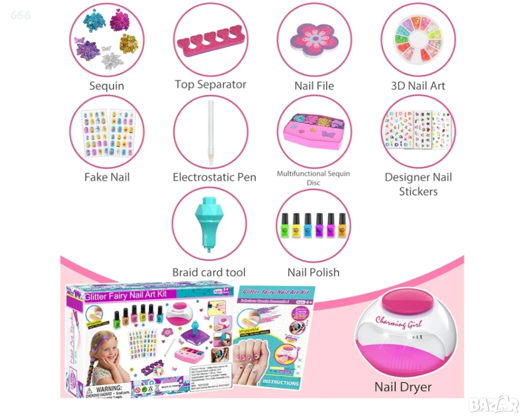 Комплекти лакове за нокти за момичета: Детският комплект лакове за нокти включва: сушилня за нокти (не включва батерии), лак за нокти*6, 3D ноктопластика, стикери за нокти*3, изкуствени нокти с анимационни герои*2, пайети за коса*5, пила за нокти, електростатична писалка, разделител за пръсти и кутия за пудра, многофункционален диск с пайети, инструмент за плитки.