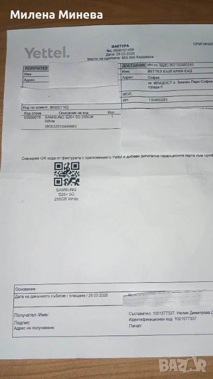 Продавам телефон,,Samsung Galaxy S26/256gb.Телефона е,чисто нов,запечатан,не е отварям.С фактура,протектор и гръб чисто нови.Телефона,беше закупен на 28.03.2026г,от Йетел за подарък,но не беше одобрен,затова го продавам.