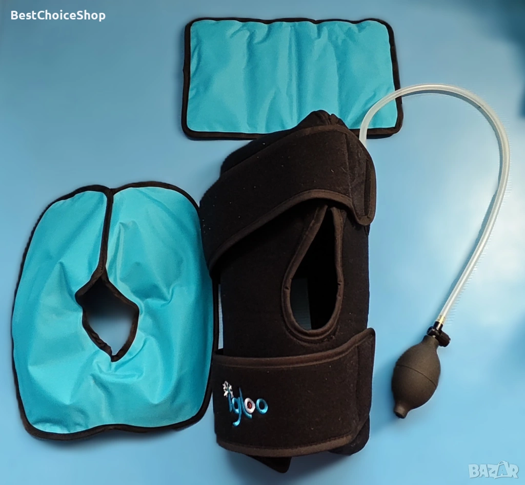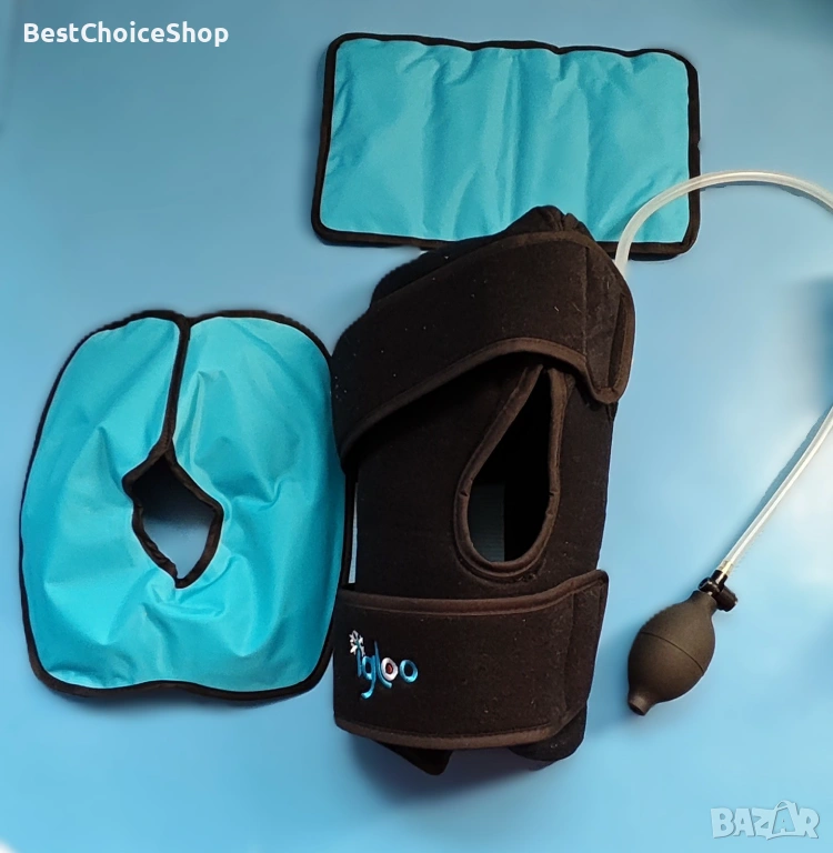 Намалява и облекчава болката благодарение на аналгетичния ефект на студа. Комфорт и лекота на употреба благодарение на 2 самозахващащи се кадифени ленти. Мускулен релаксант. Рехабилитацията е улеснена. Перфектно прилягане и отлично разпределение на гела благодарение на въздушната помпа. Включени са 2 пакета с гел за оптимално лечение.