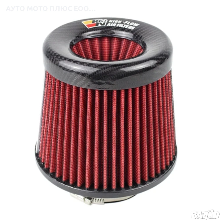 Универсален спортен въздушен филтър с висока пропускливост и характерен завършек от въглеродни влакна (карбон).