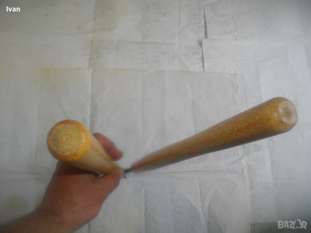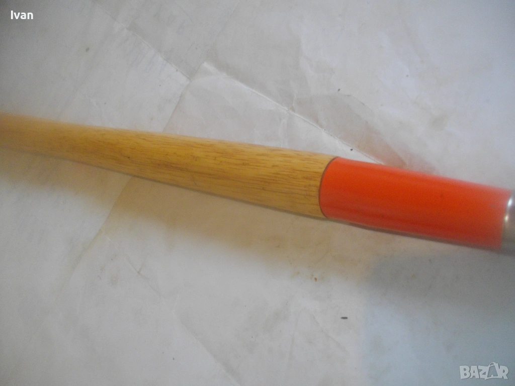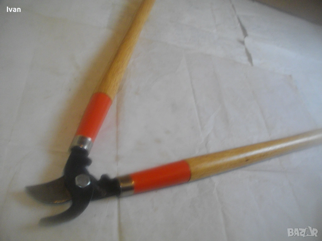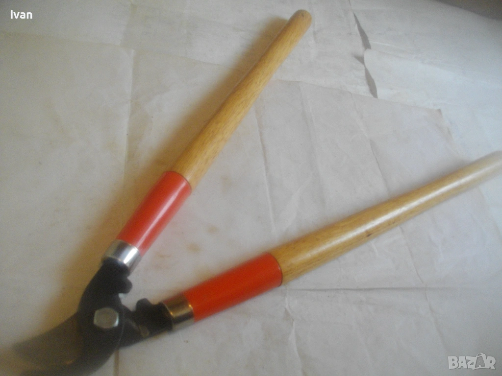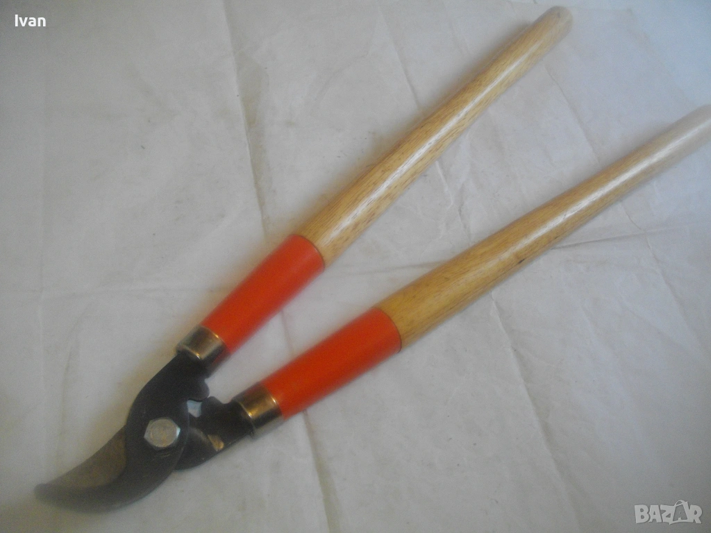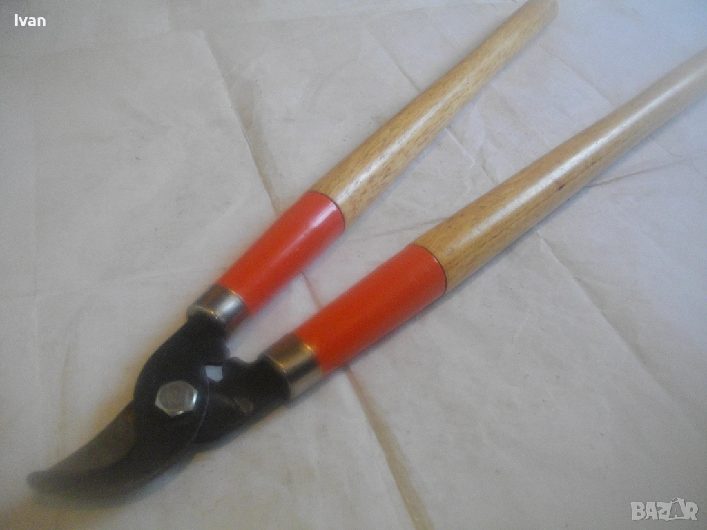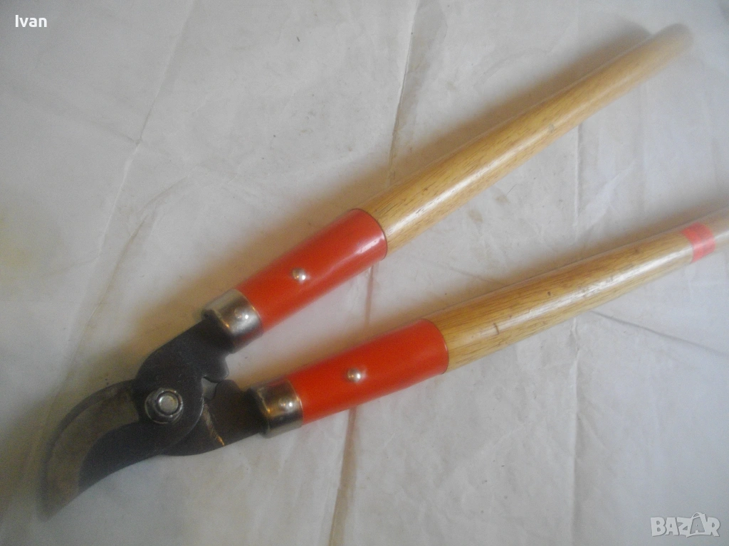 Неизползвана и неупотребявана. Дължина цялостна - 62 см, челюсти метални - тип извити, което позволя удобен, лек и бърз срез. Отваряне на челюстите - до 50 мм захват. Дръжки - масивни дървени, с диаметър ф 30мм - ф 50 мм, които отпред към челюстите са подсилени с метални пръстени, като главата на челюстите е захваната за пръстените посредством 4 нита. На едната дръжка на ножицата има немски стикер с цена в стари немски марки.