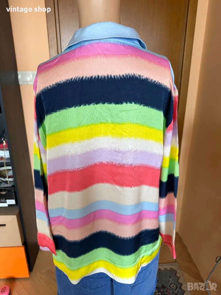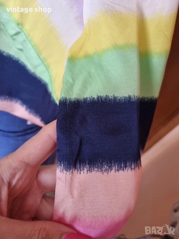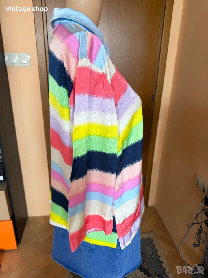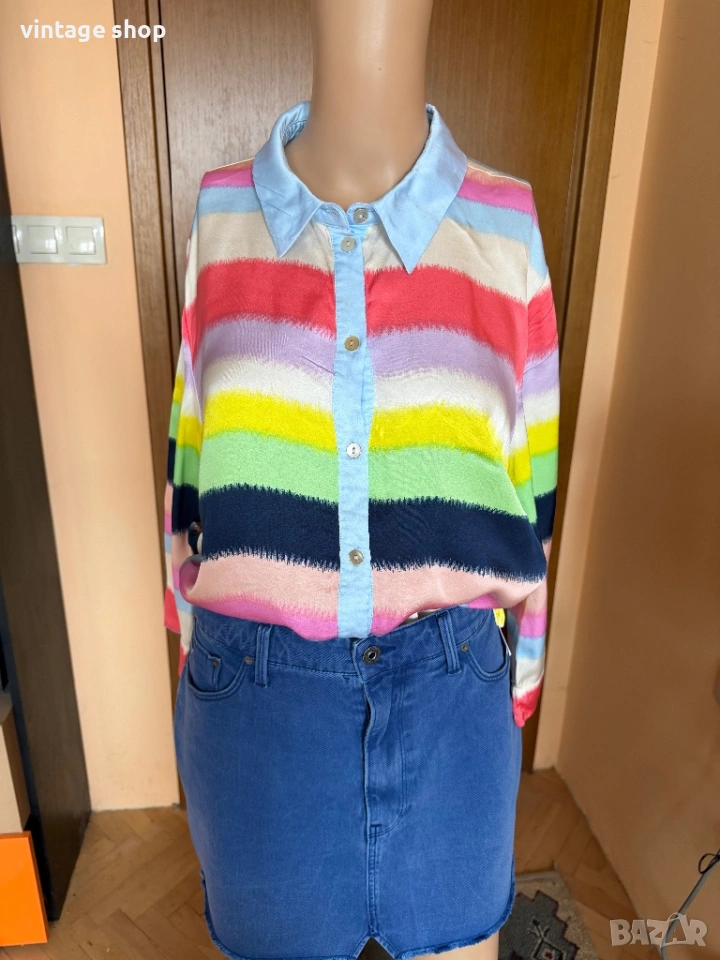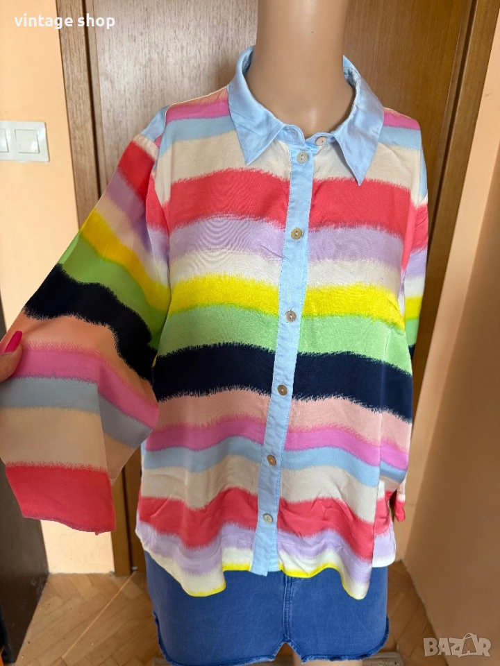 Ризата е невероятна! С цветовете на дъгата- пъстри, ярки,магнетични. Палитрата от цветове дава възможност да се съчетава с много тоналности- синьо, розово, зелено, жълто, коралово и разбира се вечния деним.
