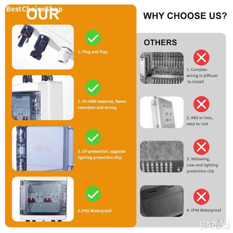 Лесен монтаж: Подобрена защита от пренапрежение на фотоволтаичната система, MC-4 plug and play свързваща клема. Вътрешното окабеляване на мълниезащитата е свързано, не е необходимо ръчно окабеляване.