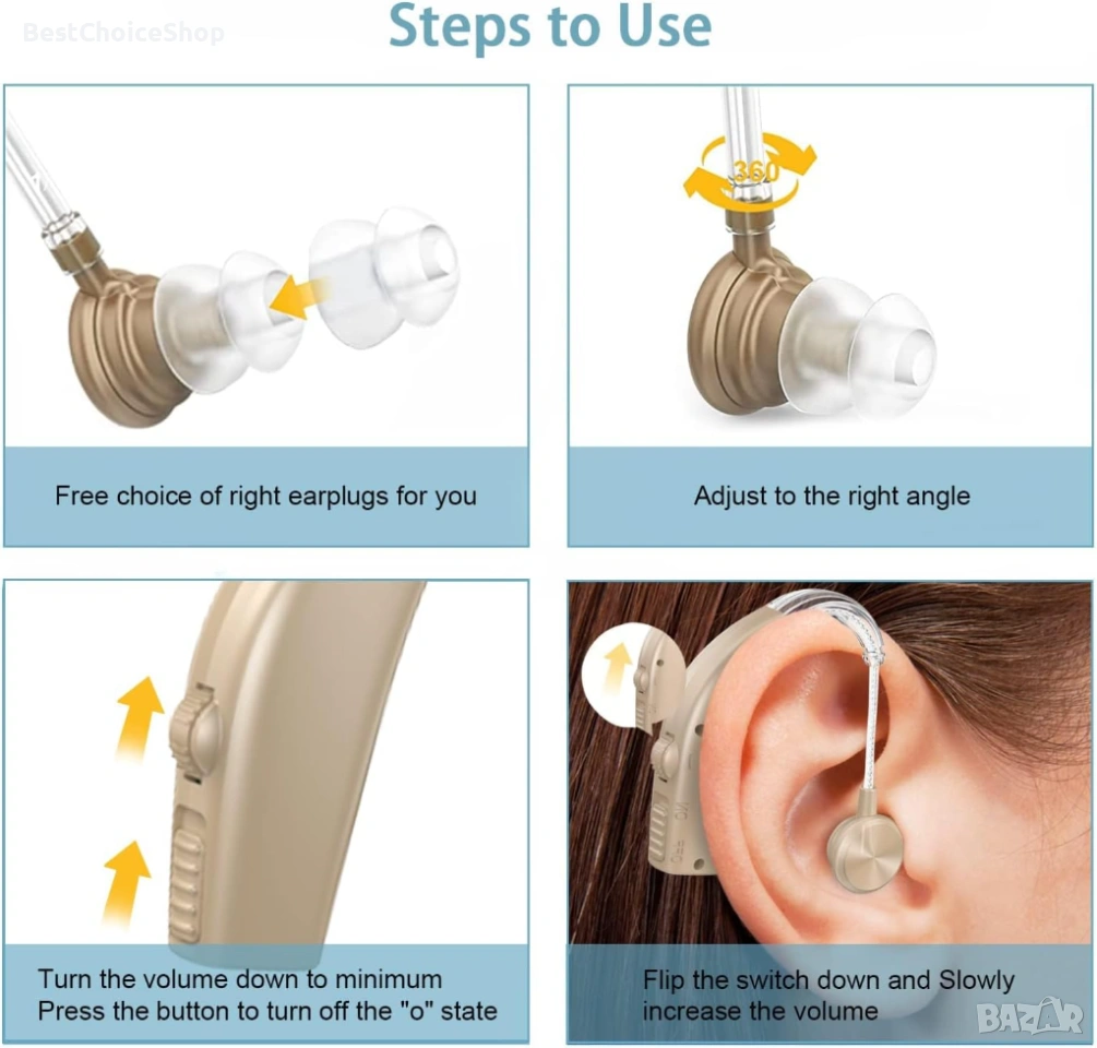 слухови апарати за възрастни хора с функция за намаляване на шума и контрол на силата на звука