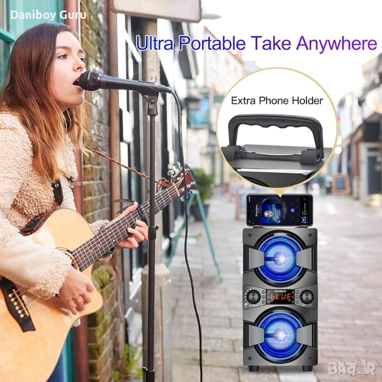 🎶 【Караоке машина】— PA система — Дървената конструкция е не само здрава, но и може да абсорбира шума, за да направи музиката по-добра и по-ясна. Предлага се с възможност за регулиране на еквалайзера според вашите предпочитания. Удобната дръжка отгоре прави този високоговорител с перфектен размер лесен за носене. Можете да поставите телефона си на дръжката, за да освободите ръката си, докато готвите или тренирате. Цветните LED светлини са наистина страхотни! (бързо щракнете двукратно върху бутона ▶‖, за да изключите светлините).