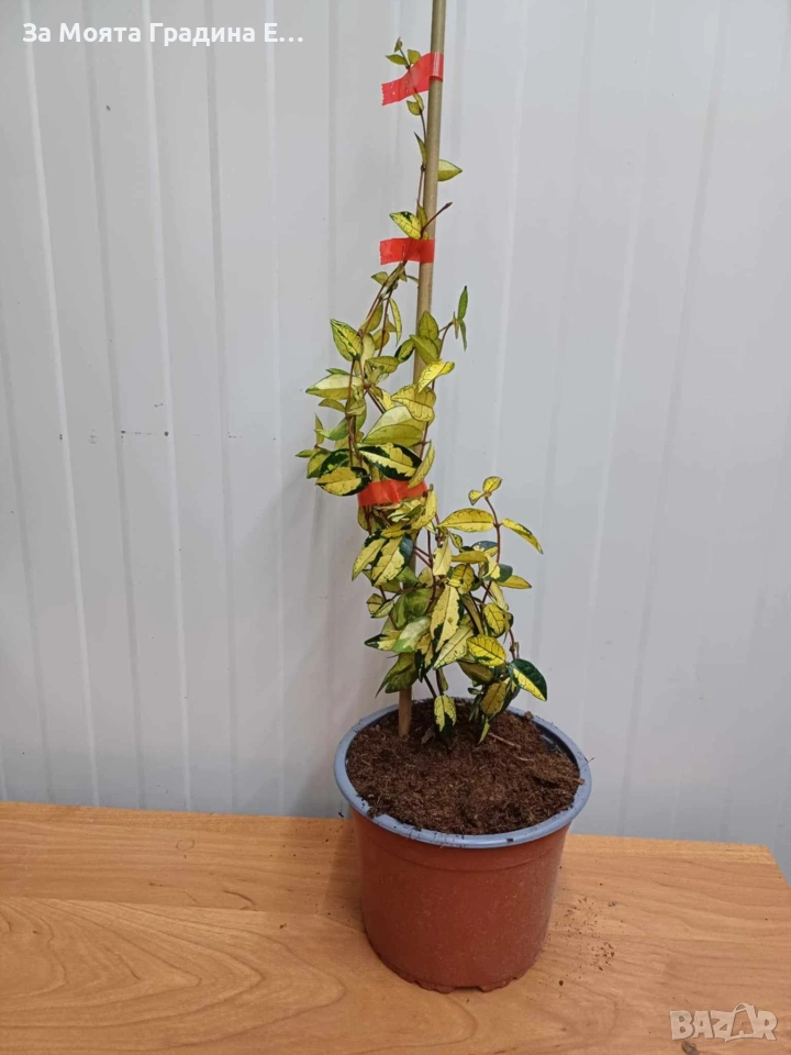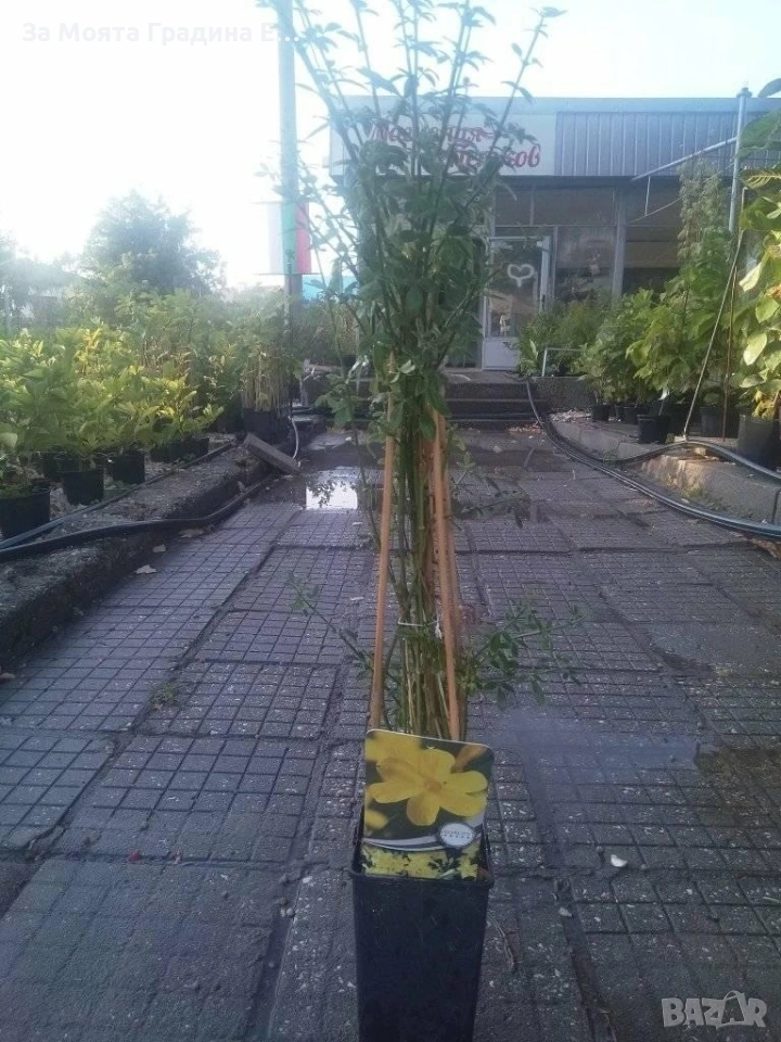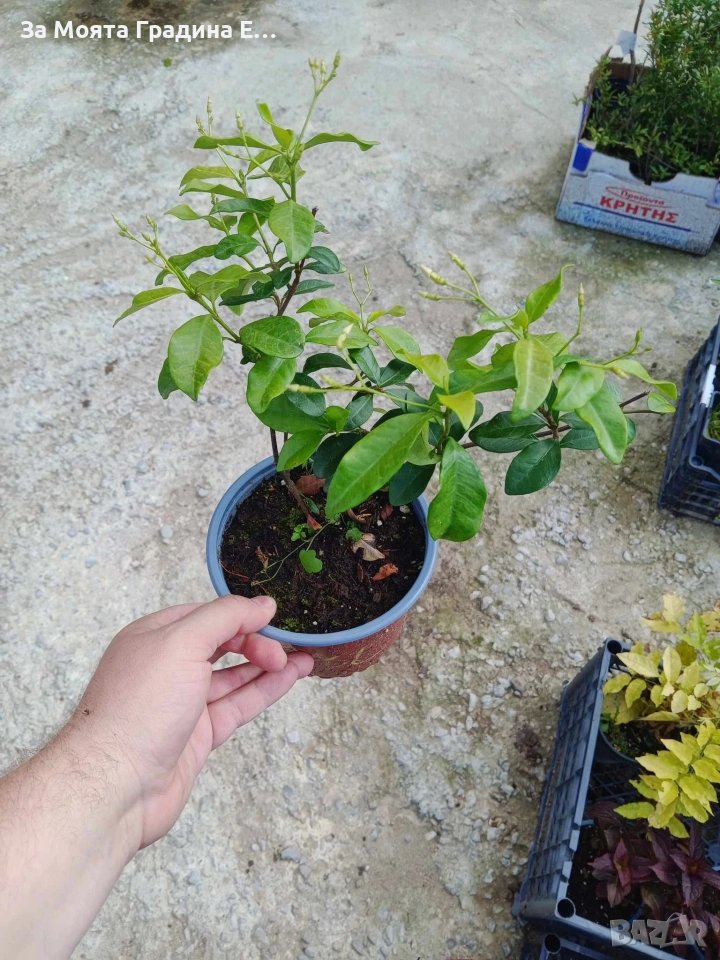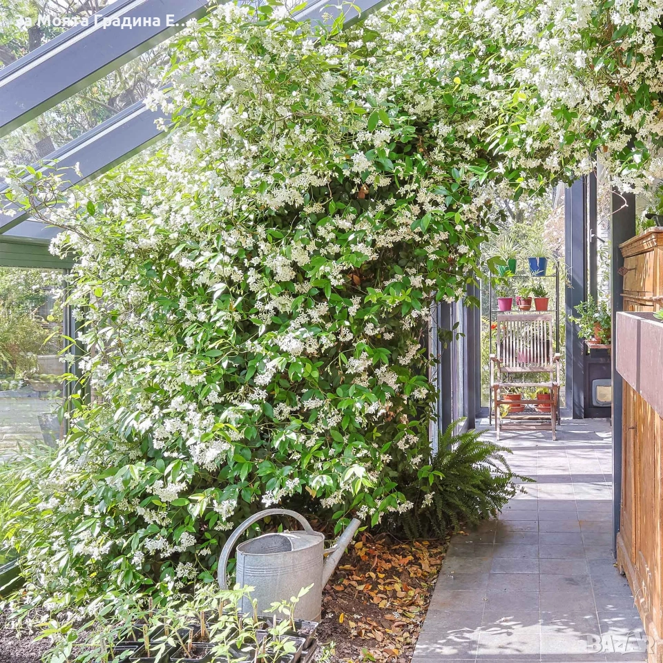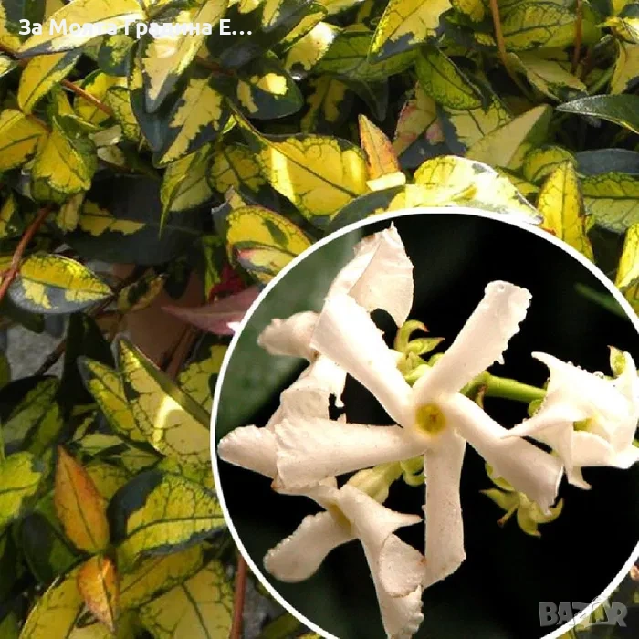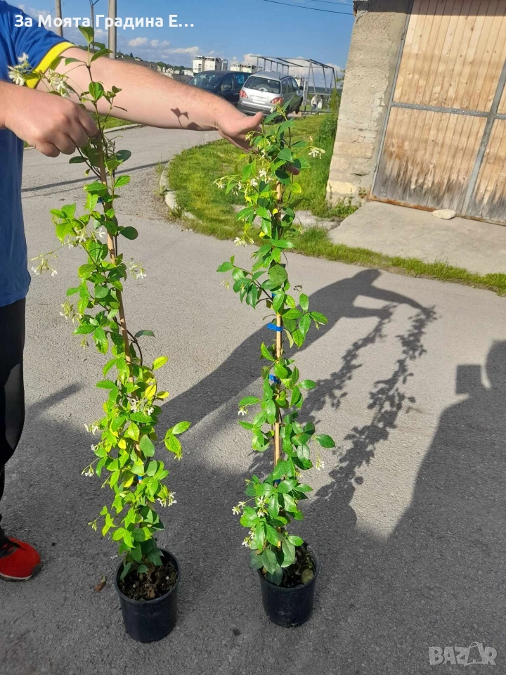 Жасмин вечно зелен Налични 4 вида Ароматен ! Цвят – Бял Размер 80-100см Цена за 1 брой 16€ и Размер 40-60см за 8€ Цвят – Жълт Сорт Звездата на Тоскана. Размер 20-30см / Цена за 1 брой 16€ Цвят – Розов Размер 20-30см / Цена за 1 брой 16€ Цвят – Кремав с шарени листа Размер 20-30см / Цена за 1 брой 16€ Този жасмин е перфектният избор за Вашите външи площи, тераси или градина, където медения аромат ще бъде оценен, а прекрасните листа ще допринесат стил на дизайна Ви. Подсигурете му опора като ограда, арка, поргола или дори може да го насадите като почвопокривно по земята. Подходящо е за отглеждане дори и в големи кашпи и саксии Растенията са в в контейнери, което позволява засаждането им да се извършва почти целогодишно. Много от растенията променят вида си през периодите на своята вегетация, но тук в сайта със снимки се представят в най-атрактивния им вид. Повечето снимки в сайта ни покзват как ще изглеждат растенията след определен период и положени необходимите грижи.