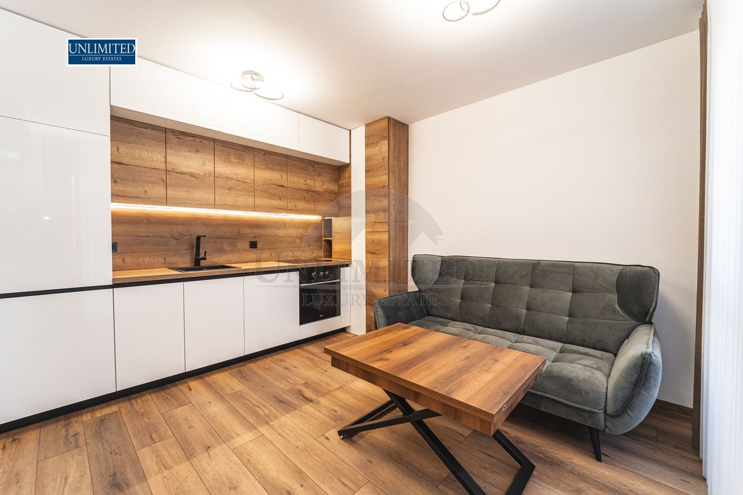 Living Room: Modern open-plan space with a high-end kitchenette (integrated fridge, dishwasher, oven, and hobs).
