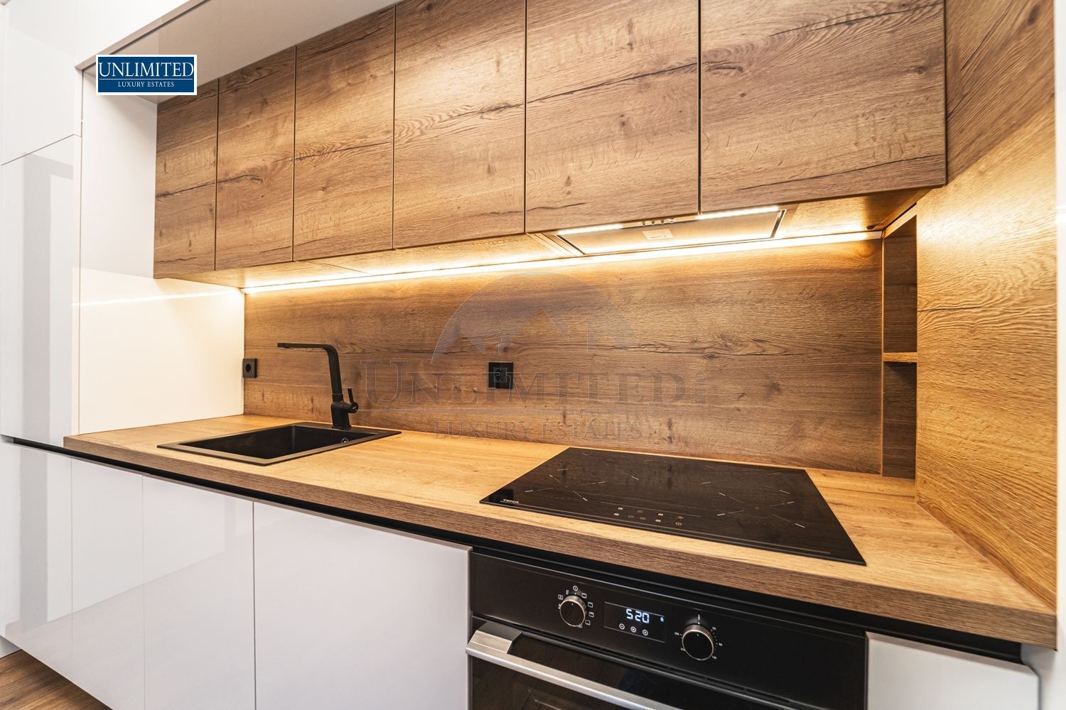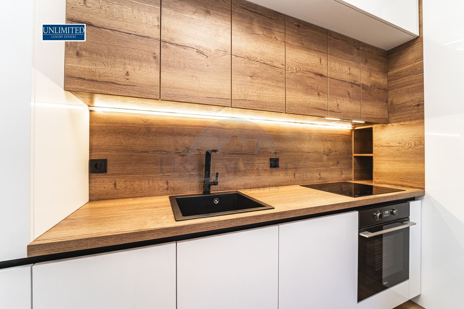 Хол: Светъл и модерен, с напълно оборудван кухненски бокс (вграден хладилник, миялна машина, фурна, котлони).