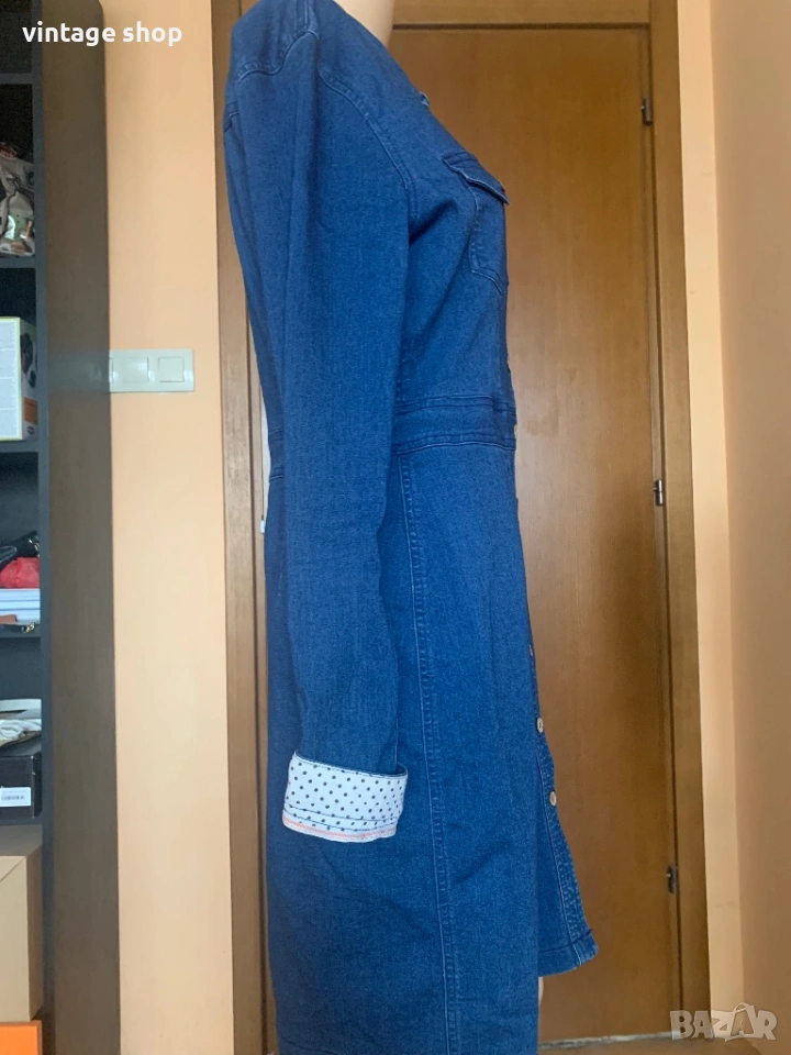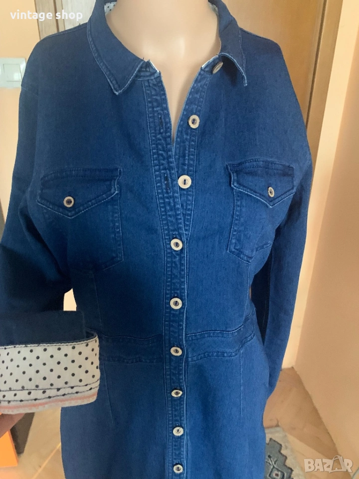 Рокля на скандинавския бранд Nümph. Вечно актуалната деним рокля. Тип риза, с копчета по цялата дължина. С два джоба отпред. Онази дреха, към която винаги можем да посегнем, когато се чудим какво да облечем. Тоналността е тъмен деним, индиго. С много закачлива, красива подплата на малки сини точки. Роклята стои по тялото много секси, следвайки извивките на тялото.