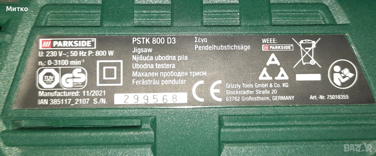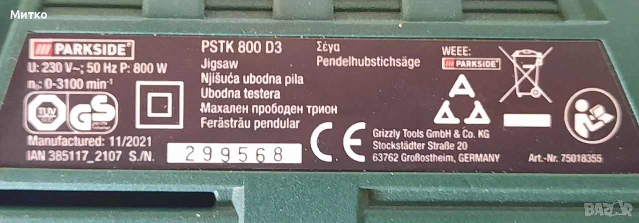 Електрически прободен трион тип ЗЕГЕ марка Парксайд модел PSTK 800 D3 PARKSIDE → Обява 54020287