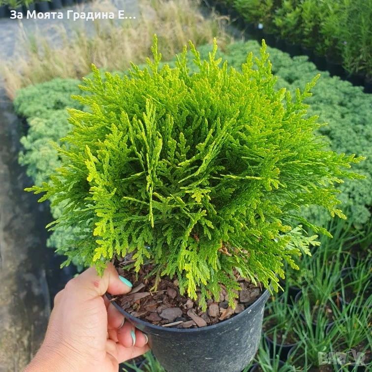 Размер 20см за 8,50€ Вечнозеления храст дава на пейзажа красива гледка през всички сезони. Туя западна Даника (Thuja occidentalis Danica) – джуджев сферичен храст от семейство кипариси. Сортът се характеризира с малки храсти – до 80 см височина и ширина. Животът на Даника е около 200 години. Растението е силно издръжливо на минусови температури и обича мокрите, но добре дренирани почви. Растението е подходящо като единично и в различни композиции като алпинеуми и рокарии. Растенията ни са в саксии и това позволява да се засаждат цяла година или могат да се гледат така с месеци