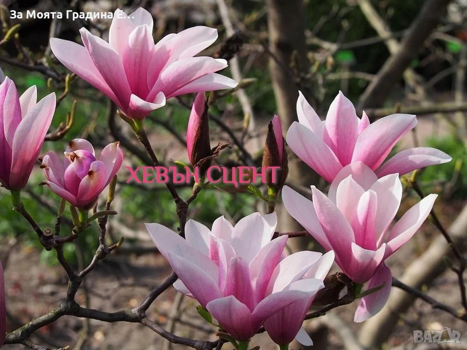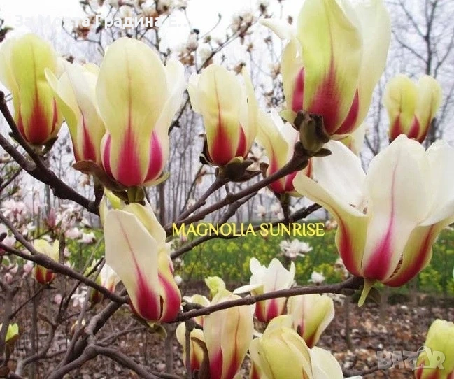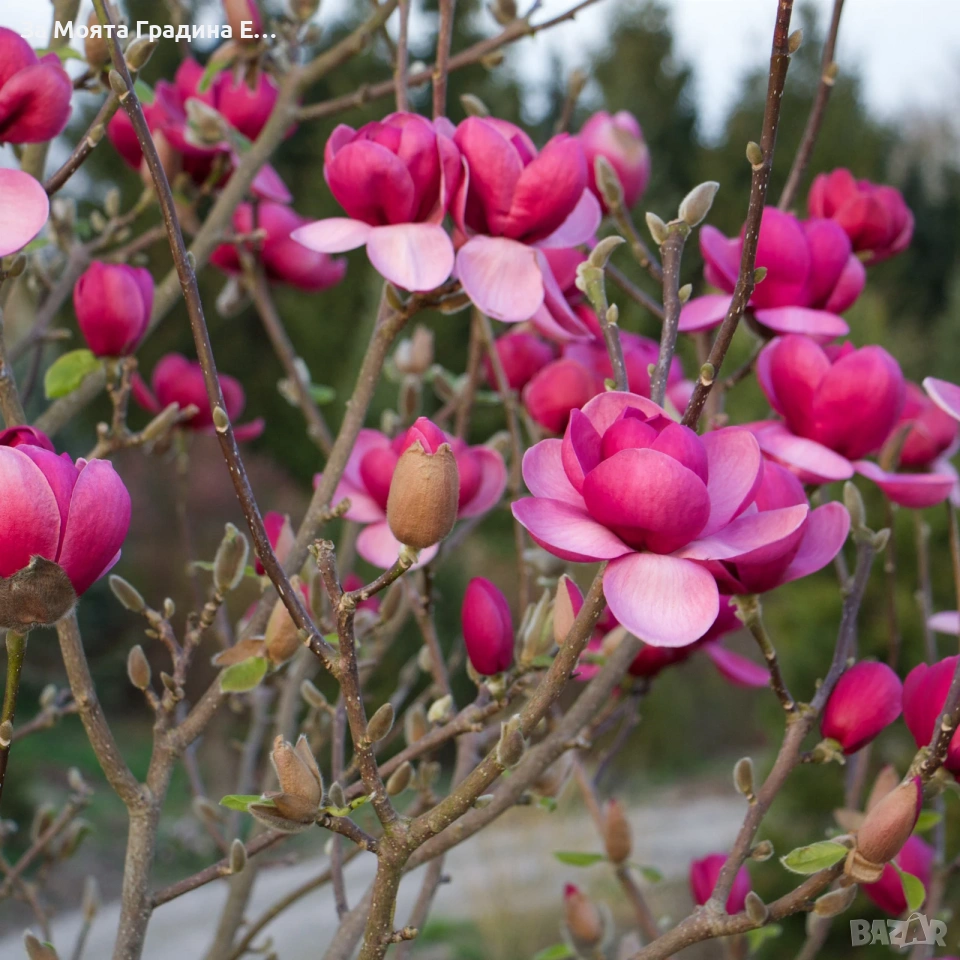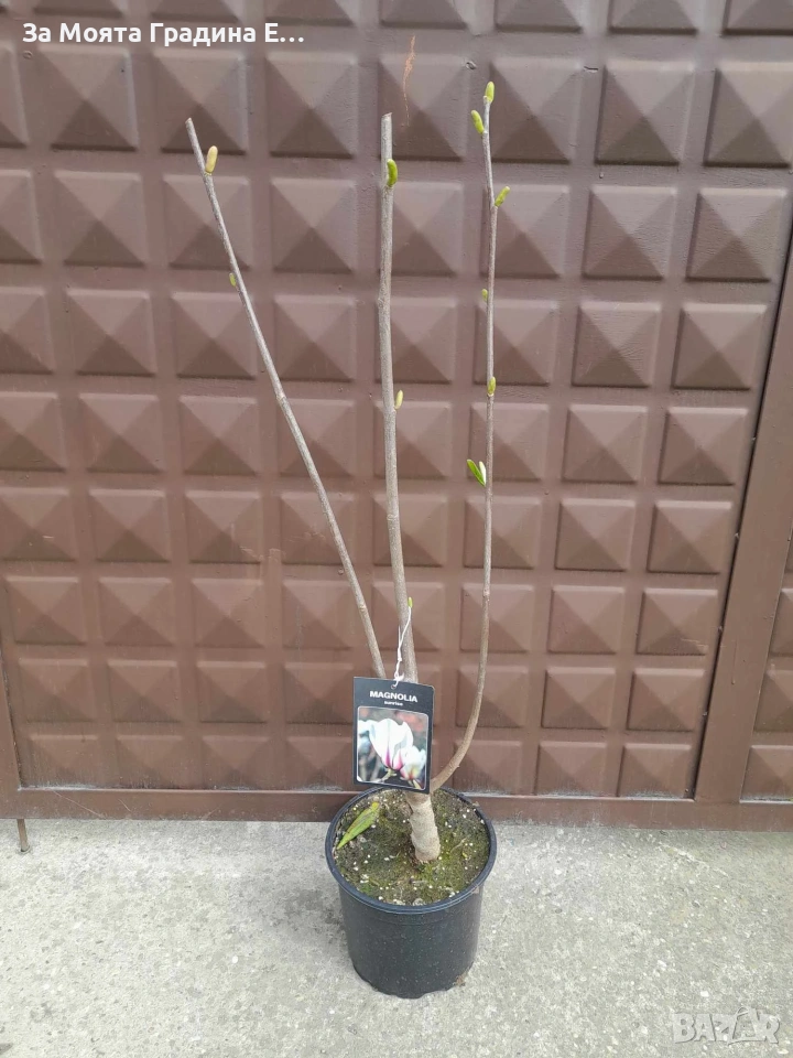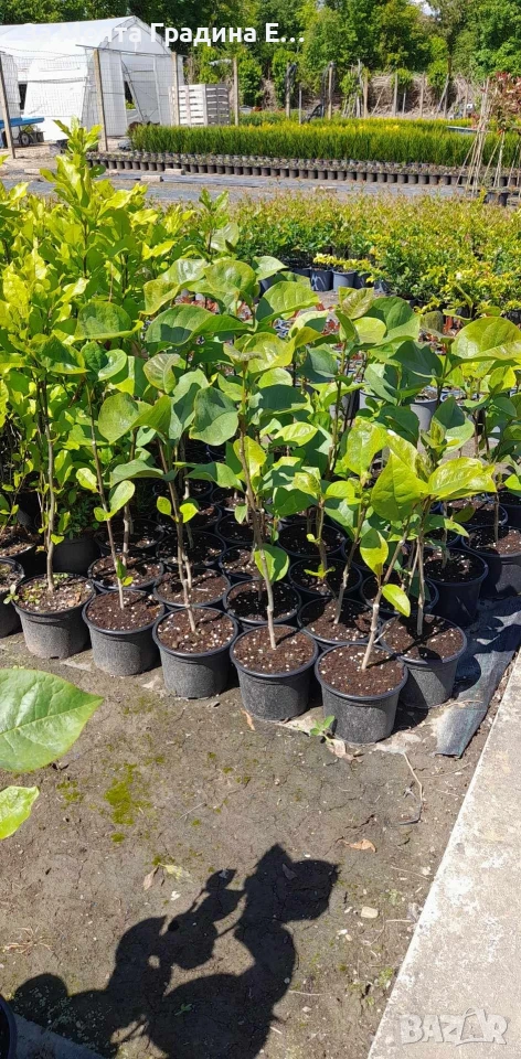 1️⃣ Magnolia grandiflora – вечно зелена СТУДОУСТОЙЧИВА Размер 50-70см Цена за 1бр 30 € Размер 80-100см за 37 € 2️⃣ Магнолия Сюзън – Magnolia Susan наситено цикламен цвят. Размер 50-70см за 13 Растения на 2г , -Растения на 3-4г Размер 110-130см за 32€ - Растения на 5-6г Подрязани на тези размери 110/130см. 37€ 3️⃣ Магнолия Солангеана – Magnolia Soulangeana Бяло с Розово 80-100см за 14 € Растения на 2г и Размер: 120–140 см, подрязани и оформени растения, 5-годишни 37 € 4️⃣ Жълта Магнолия – Златна мечта Студоустойчива Размер 90-110см за 26,50 € 5️⃣ Магнолия Джордж Хенри Керн -Magnolia Henry Kern – розов цвят Размер 60-80см за 14€ Размер 130-150см за 32€ 6️⃣ Магнолия Нигра – Magnolia Nigra Лилав цвят Размер 50-70см за 14€ 7️⃣ Магнолия Джени– Magnolia Genie Размер 70-90см. 35€ 8️⃣ МАГНОЛИЯ БЛЕК БЮТИ – MAGNOLIA BLACK BEAUTY Цена 38 € Размер 70-90см. 9️⃣ Магнолия Сиеболди -Magnolia Sieboldi Размер 60-80см. 14€ 🔟 Магнолия Хевън Сцент – Magnolia Heaven Scen – Прасковен цвят 80-100см за 13,50€ 1️⃣1️⃣ Магнолия “Черно Лале” / Magnolia “Black Tulip” Цена за 1 саксия 39,00€ Височина в момента около 70-90см Достига височина до 2 м. 1️⃣2️⃣ Магнолия – (“Жълт фенер“) Magnolia ‘Yellow Lantern’ Размер 30-35см. 30€ 1️⃣3️⃣ Магнолия Стелата Magnolia Stellata Royal star Размер около 50-70см. 14€ 1️⃣4️⃣ Жълта Магнолия – Златна мечта Размер 90-110см за 27 € 1️⃣5️⃣ Магнолия Алба Суперба – ( Alba Superba ) Цена 22€ размер 70-90см. 1️⃣6️⃣ Магнолия Леней Алба – Lenei Alba Цена 14 € 1️⃣7️⃣ Магнолия Blue Baby (Magnolia acuminata ‘Blue Baby’) Размер 60-80см. Цена 44 € 1️⃣8️⃣ Магнолия Елизабет – Magnolia Elizabet Цена 42 € Размер 130-150см 1️⃣9️⃣ Магнолия Sunrise – жълто с розово Подрязани растения на около 30-40см Цена 49,00 € ✅Много от растенията променят вида си през периодите на своята вегетация, но тук в сайта със снимки се представят в най-атрактивния им вид. Повечето снимки в сайта ни покзват как ще изглеждат растенията след определен период и положени необходимите грижи. За Вас остава удоволствието да постигнете вида им от снимките, а защо не и по красиви.