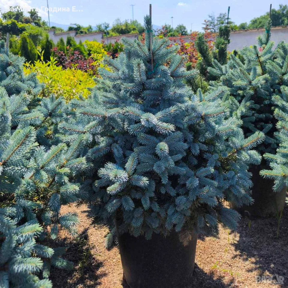 30-40см за 16 € Picea pungens, известен като Сребрист смърч или Син смърч, е едно от най-популярните декоративни иглолистни дървета. Отличава се с плътна, правилна пирамидална форма и характерни сребристо-сини игли, които му придават изключителна декоративна стойност през цялата година. Характеристики Височина: 10–20 м (в зряла възраст) Растеж: бавен до среден Игли: къси, твърди, с интензивен сребристо-син цвят Коронa: плътна, конична, много симетрична Студоустойчивост: отлична, до –30°C Предимства Изключително декоративно през цялата година Лесно адаптивно – подходящо за градски условия Идеално за солитерно засаждане (самостоятелно дърво) Подходящо за дворове, паркове, алеи, представителни пространства Изисквания Място: слънчево за по-интензивен син цвят Почва: добре дренирана, умерено влажна Поливане: умерено, без подгизване Поддръжка: минимална; не изисква оформяща резитба Растенията са в контейнери, което позволява засаждането им да се извършва почти целогодишно. Много от растенията променят вида си през периодите на своята вегетация, но тук в сайта със снимки се представят в най-атрактивния им вид. Повечето снимки в сайта ни покзват как ще изглеждат растенията след определен период и положени необходимите грижи