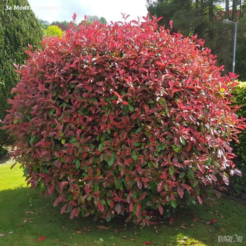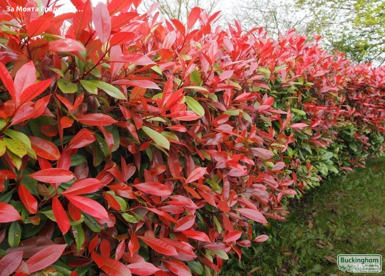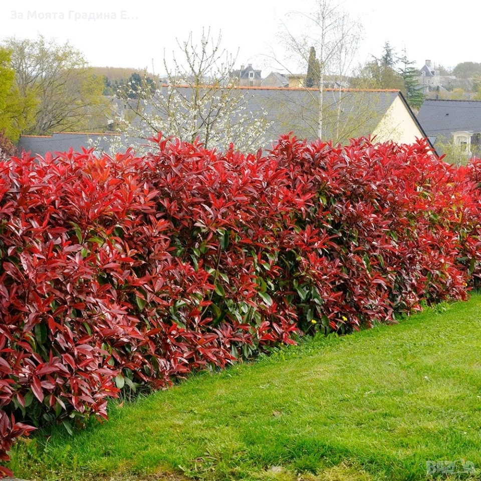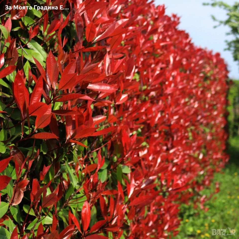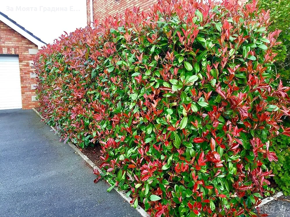 1️⃣ Фотиния (Photinia lital ‘Red Robin’) Дребнолистен Максилама височина 2-3м Фотиния (Photinia ‘Red Robin’) е многогодишен вечнозелен храст. Достига височина 2-3 метра, а на ширина до 2 метра. Има добър растеж, годишно нараства с 20-30 см. Листата са заострени, леко назъбени, дълги, на пролет в млада възраст имат огнен яркочервен цвят, а по-късно стават тъмнозелени с гланцов блясък. Листата са разположени върху кръгли и гладки стъбла. През май фотинията цъфти с красиви бели цветчета, с мек аромат, събрани в метловидни съцветия, които привличат медоносните пчели. Образувалите се плодчета са червени. Интересен храст за самостоятелно засаждане ,в групи или живи плетове.