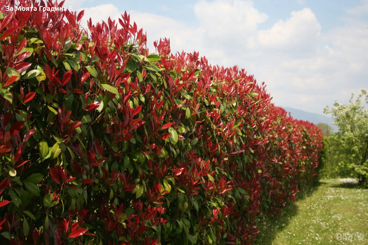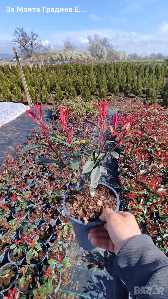 Фотиния – Налични 2 вида 1️⃣Фотиния (Photinia lital ‘Red Robin’ Дребнолистна Максимален растеж 2-3м. Подрязани расстения на 20-30см цена за бр. 5,50 € 2️⃣Фотиния Ред Робин Едролистна Максимален растеж 3-4м. Подрязани растения на 20-30см Цена за 1бр 7,40 € Студоустойчива Фотиния – Бързо растящ храст който е подходящо за живи плетове Фотонията е малко позната у нас все още, но бързо набира популярност сред любителите-градинари. Среща се като храст или като малко дърво. Може, обаче, да бъде оформена по най-различен начин – едностеблено дръвче с топчеста корона и дори няколко „топки“, последователно разположени във височина, както и многостеблен храст с по-широка или висока и прибрана корона. По нашите географски ширини вирее доста добре, тъй като издържа на отрицателни температури до -20 ͦC. Предпочита слънчеви места, но би могло да се засади и на полусянка. Изисква дълбока и влажна почва, ето защо е добре субстратът, който ще се използва при засаждането да има добри дренажни свойства. През пролетта – преди и по време на цъфтежа, както и през есенните месеци е изключително красива. Ярките червени листа по върховете на клонките правят силно впечатление. Ако се засади на полусянка, връхните листа няма да бъдат с толкова наситен цвят. Фотинията е вечнозелена, което я прави растение с висока декоративна стойност. Би могло да се засади самостоятелно или при оформяне на група от растения в градината, дори често се използва и за жив плет. Изключително подходяща при озеленяване на тераси – най-удачно с южно изложение. В този случай е желателно да се използва достатъчно голяма саксия/кашпа