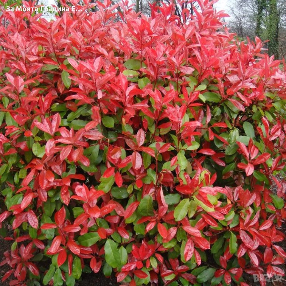 2️⃣ Фотиния Ред Робин Едролистен Максимална височина 4м Фотиния е многогодишен, студоустойчив и вечнозелен храст. През зимата издържа до -20 градуса. Достига височина около 4 м. Младите листа са червени и лъскави. Цъфти през април-май. Може да бъде засаден на слънце и полусянка. Ако го засадите на полусянка младите листа няма да са толкова наситено червени. Подходящ е за формиране на жив плет, бордюр, като единично растение или за контраст с група растения. Растенията са в контейнери, което позволява засаждането им да се извършва почти целогодишно. Много от растенията променят вида си през периодите на своята вегетация, но тук в сайта със снимки се представят в най-атрактивния им вид. Повечето снимки в сайта ни покзват как ще изглеждат растенията след определен период и положени необходимите грижи. 0️⃣8️⃣7️⃣7️⃣9️⃣7️⃣7️⃣5️⃣1️⃣9️⃣