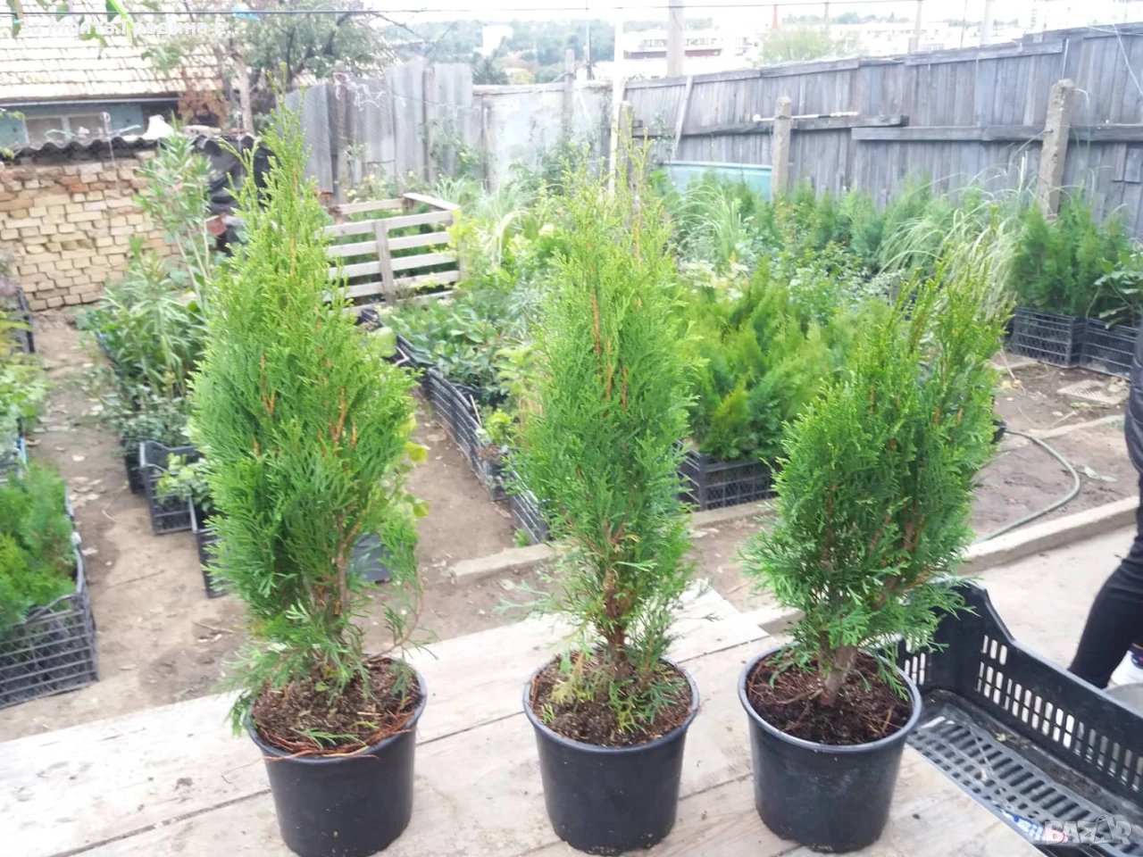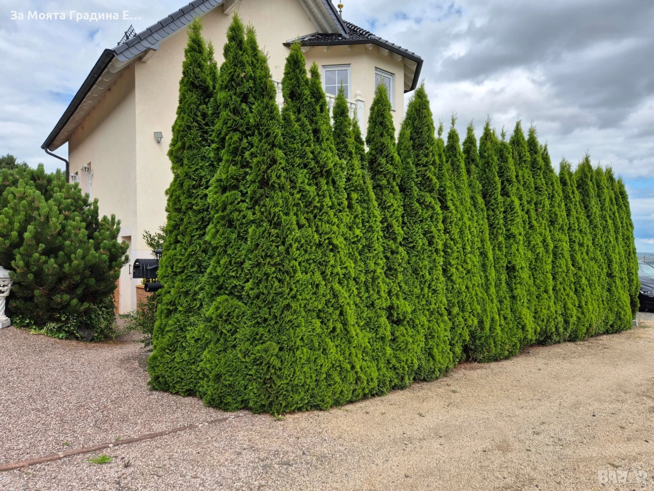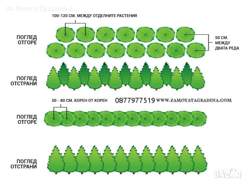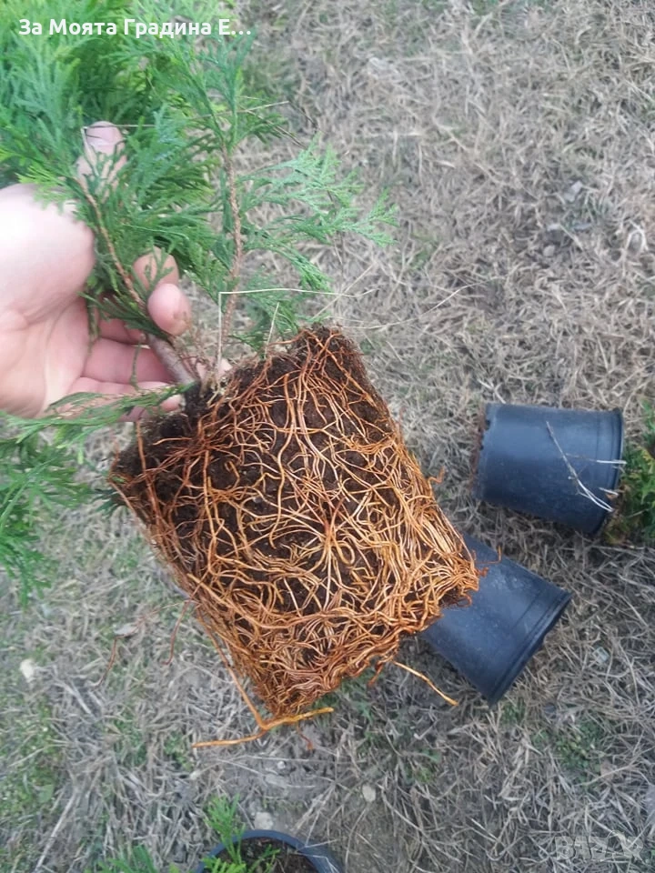 ТУЯ ЗАПАДНА СМАРАГД Иглолистен вечно зелен храст, получил името си заради специфичния изумридено-зелен цвят на листата. Расте доста бързо – около 30-40см. височина годишно. Популярна е заради свежия си и привлекателен цвят, който запазва през цялата година, както и приятната текстура на листата. Заради естествения начин на оформяне в повечето случаи е нужна резитба само на върха, при достигане на желаната височина, ако се използва за жив плет. За да се развива добре има нужда от слънце, продородна и добре-дренирана почва и редовно поливане в първите няколко години от живота си. След като се аклиматизира на новото място и развие добра коренова система не се нуждае от толкова грижи с поливането. Изключително подходяща за оформяне на високи живи плетове. Стои чудесно в градината като единично растение или жив плет. Растенията са в в контейнери, което позволява засаждането им да се извършва почти целогодишно. 🌲КАК ДА САДИМ ЖИВ ПЛЕТ ОТ ТУЯ? Доста често сме получавали запитвания, как точно се сади жив плет, от някои видове туи, на какво разстояние корен от корен и т.н. Затова решихме да напишем едно кратко упътване, за това какви са стъпките за успешно засаждане на жив плет от туя. Обикновено жив плет от различни видове туи (Източна Туя, Туя Западна Колоновидна, Смарагд, Туя Западна Стоуик ) се сади в един ред, на разстояние между 50 и 80 см. корен от корен. В някои случаи, когато има нужда от по-гъст плет, за по-кратко време се прибягва и до двуредово засаждане, като двата реда sа разположени на зиг-заг. В такъв случай най-подходящо е да се остави разстояние от 50 см. между двата реда и 100-120 см. между отделните растения. Стъпка 1. Използвайте права лопата, за да изкопаете ров, с дълбочина 1 лопата и ширина 2 лопати, в зависимост от нужната ширина на засаждане на живият плет, който смятате да посадите. Изкопаната пръст струпайте на едната страна на рова, като внимателно отстраните плевели или корени. Стъпка 2. Използвайки вила или обикновена лопата, насипете известно количество добре угнил оборски тор или компост на дъното на рова, който вече изкопахте. След това насипете обратно земята, която извадихте от рова, при предишната операция, като внимателно разбиете всички по едри буци и се опитате да я размесите с насипаният тор/компост. Стъпка 3. След като извадите растението за засаждане от контейнера, без да се притеснявате разрешете и разчоплете настрани, оплетените около дъното на саксията млади корени на растението. За целта може да използвате и лозарска ножица, ако не ви е удобно да го направите с ръце.