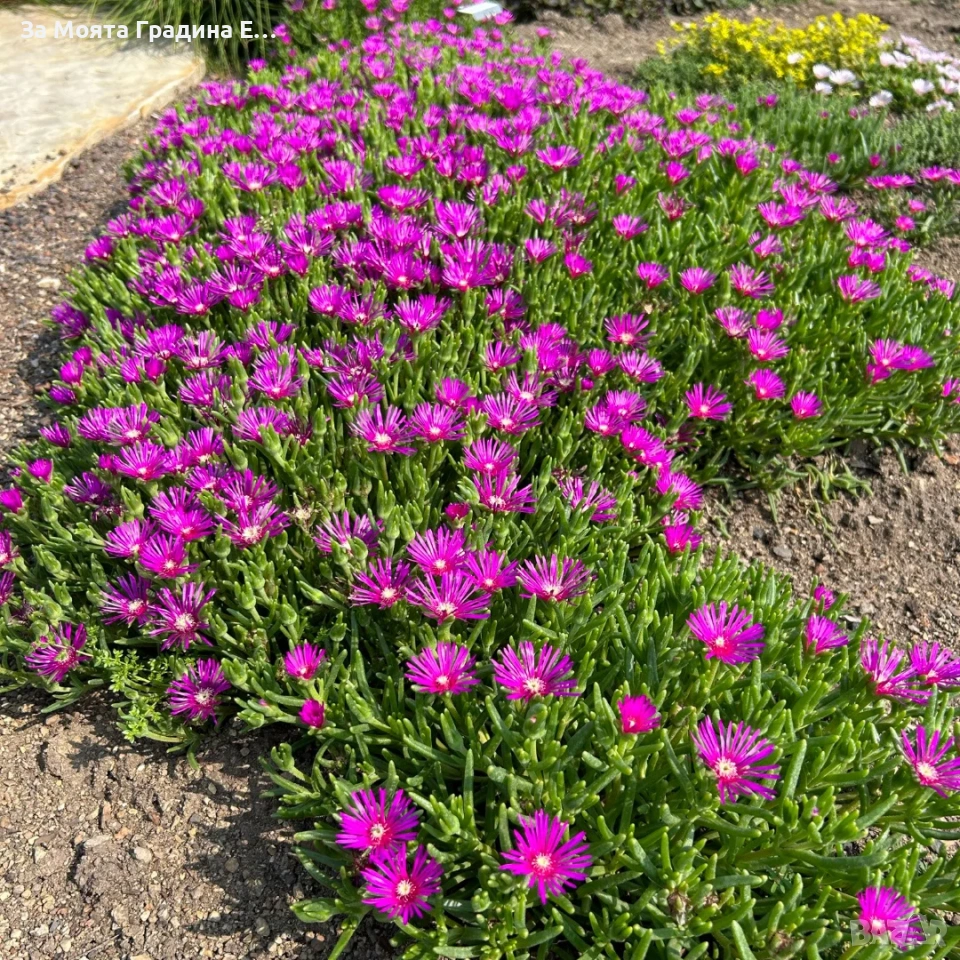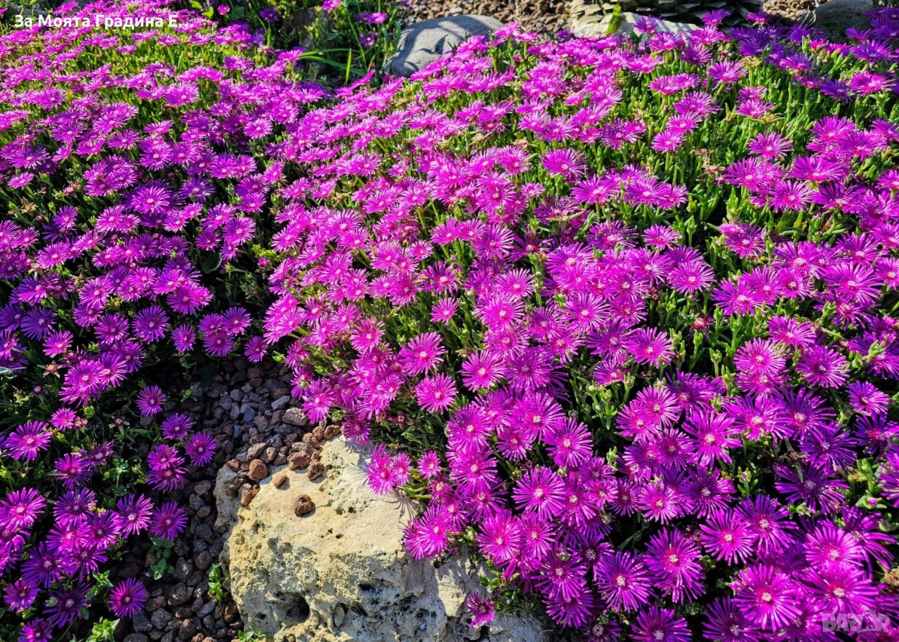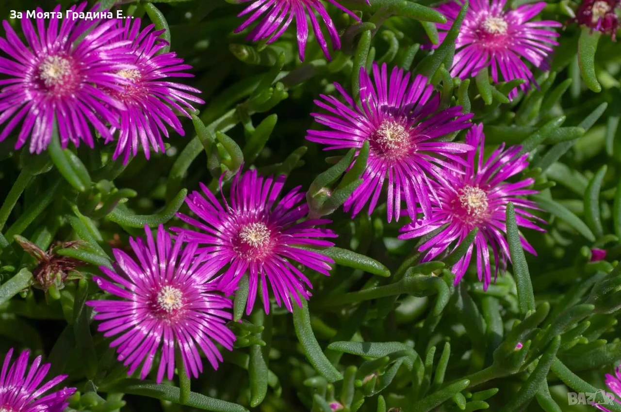 Делосперма лилава / Delosperma Cooperi table mountain / Налични 3 цвята Лилава , Оранжева и Жълта Цена за 1бр 5 € Вечнозелено, почвопокривно и каскадно сукулентно полухрастче. Леторастите са лежащи, образуват плътен килим. Достига височина 5-10 см, ширина 30-40 см. Почвенопокривно и каскадно растение. По отношение на температурата през лятото няма ограничения – колкото по-топло, толкова по-добре. Делоспермата е превъзходно растение за горещи и сухи учстъци на пълно слънце. Може да се използва в алпинеуми и скални кътове, в комбинация с други сукулентни, а също така с джуджести и бавнорастящи иглолистни растения и може да бъде прекрасен фон в един пинетум. Изключително подходяща за екстензивни покривни градини. Не изисква често поливане, не измръзват, целодневното слънце и горещина не им пречи, с това растението е подходящо дори за къщата ви която не посещавате често или нямате вода на засаденото място! Растенията са в контейнери, което позволява засаждането им да се извършва почти целогодишно. Много от растенията променят вида си през периодите на своята вегетация, но тук в сайта със снимки се представят в най-атрактивния им вид. Повечето снимки в сайта ни покзват как ще изглеждат растенията след определен период и положени необходимите грижи.