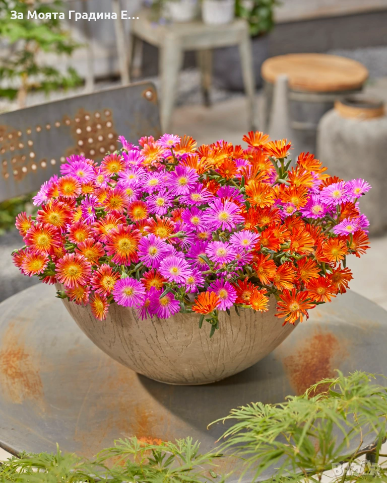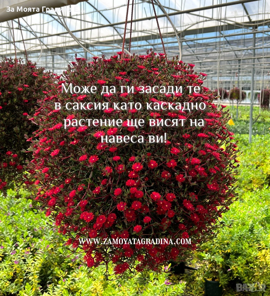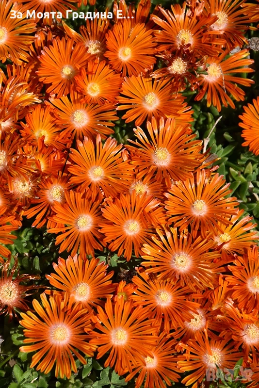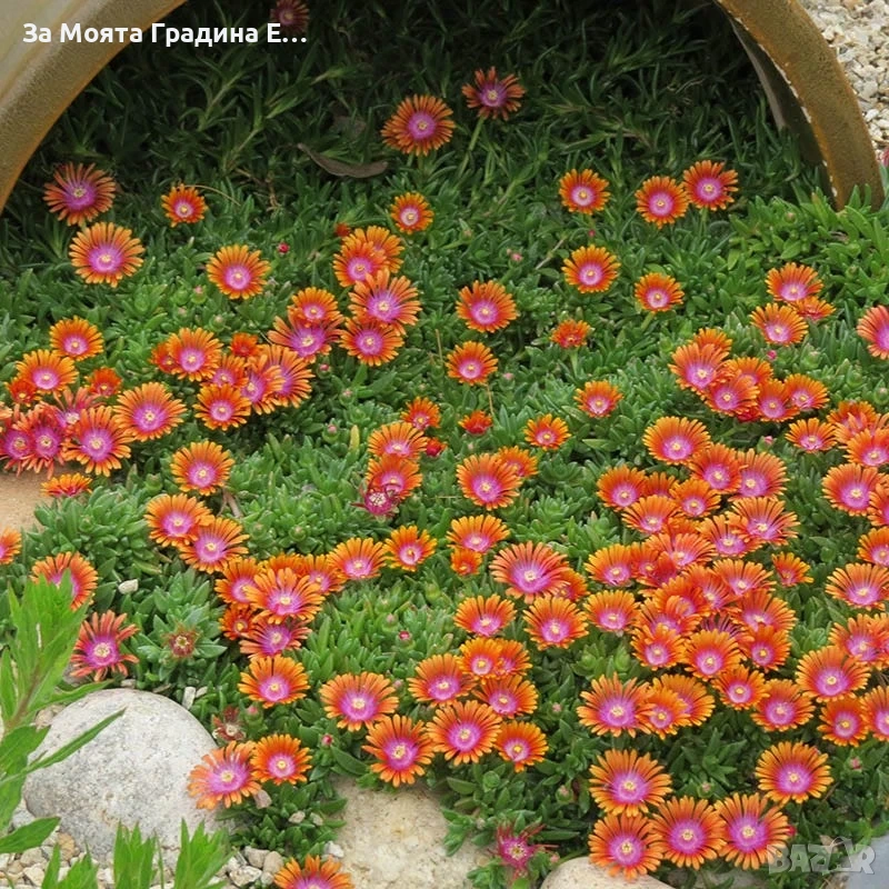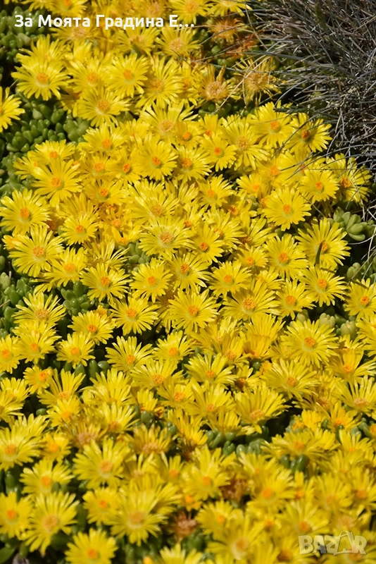 Делосперма лилава / Delosperma Cooperi table mountain / Налични 3 цвята Лилава , Оранжева и Жълта Цена за 1бр 5 € Вечнозелено, почвопокривно и каскадно сукулентно полухрастче. Леторастите са лежащи, образуват плътен килим. Достига височина 5-10 см, ширина 30-40 см. Почвенопокривно и каскадно растение. По отношение на температурата през лятото няма ограничения – колкото по-топло, толкова по-добре. Делоспермата е превъзходно растение за горещи и сухи учстъци на пълно слънце. Може да се използва в алпинеуми и скални кътове, в комбинация с други сукулентни, а също така с джуджести и бавнорастящи иглолистни растения и може да бъде прекрасен фон в един пинетум. Изключително подходяща за екстензивни покривни градини. Не изисква често поливане, не измръзват, целодневното слънце и горещина не им пречи, с това растението е подходящо дори за къщата ви която не посещавате често или нямате вода на засаденото място! Растенията са в контейнери, което позволява засаждането им да се извършва почти целогодишно. Много от растенията променят вида си през периодите на своята вегетация, но тук в сайта със снимки се представят в най-атрактивния им вид. Повечето снимки в сайта ни покзват как ще изглеждат растенията след определен период и положени необходимите грижи.