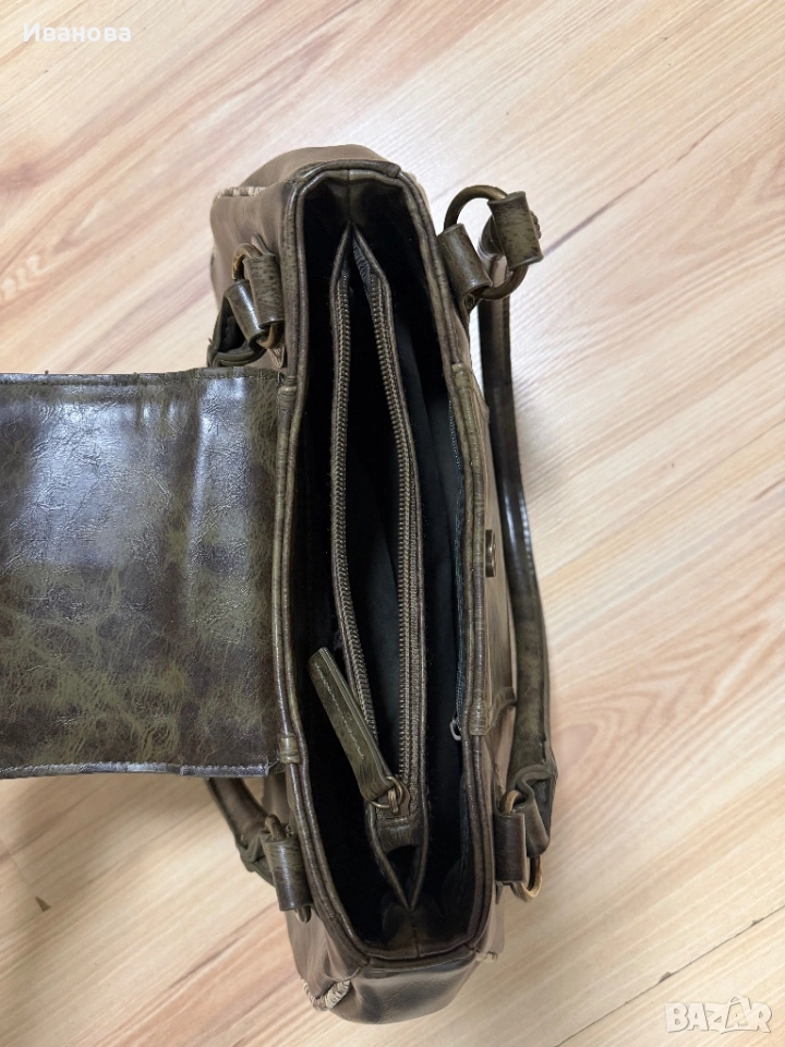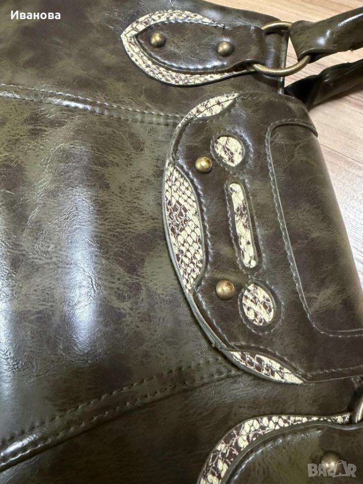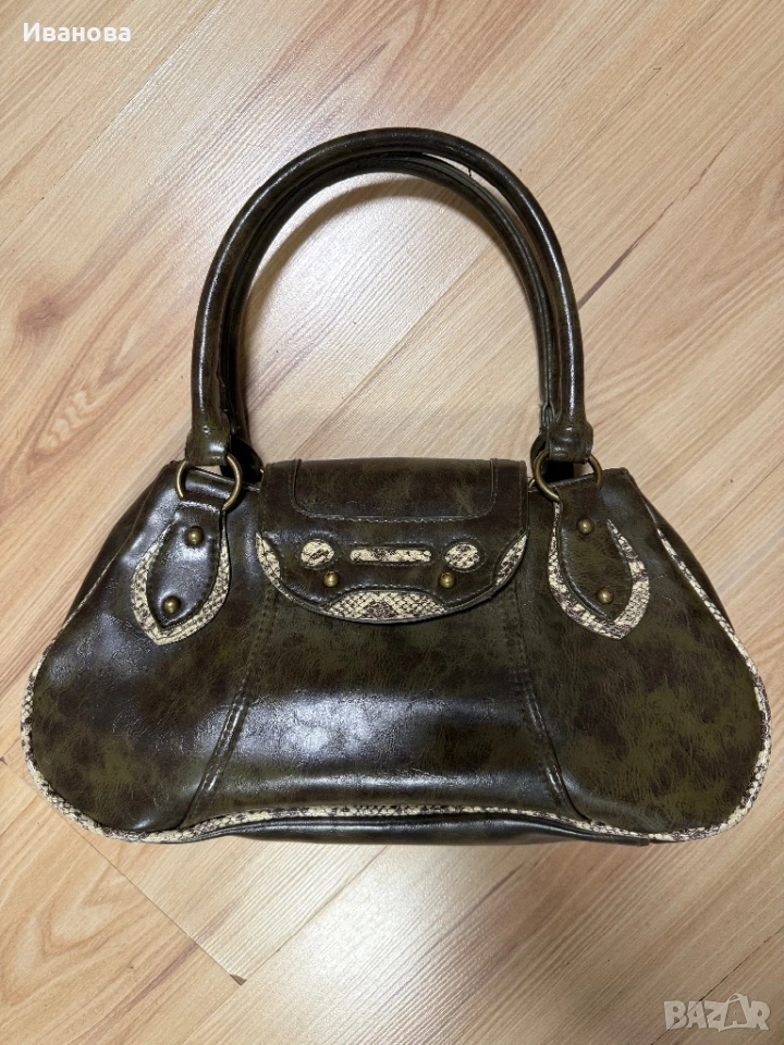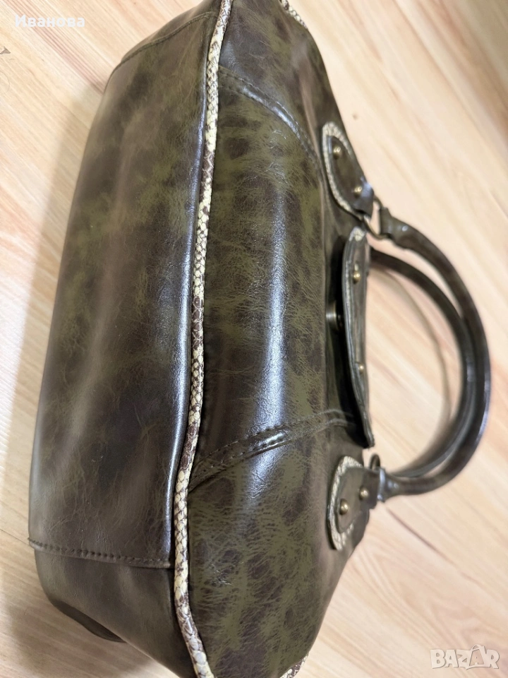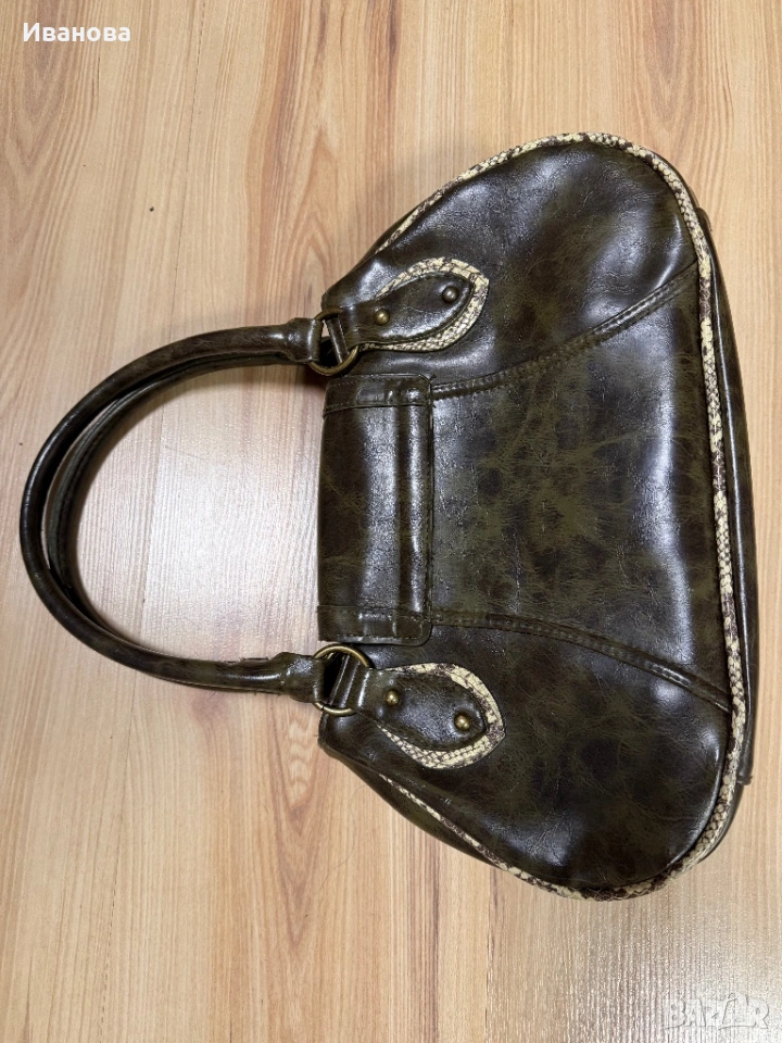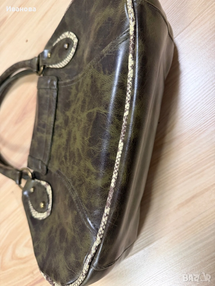 Чантата е без забележки. Носена е много малко и е оригинал от Италия. Естествена здрава и дебела твърда кожа със змийски шарки. Размерите й са 32 см дължина, 20 см височина и 9 см широчина на дъното като при пълна чанта се разтяга още с поне 5 см. Две отделения и още две отделения с цип и един малък вътрешен джоб. Общо 4 джоба с едно малко джобче. За София е възможно и лично предаване.