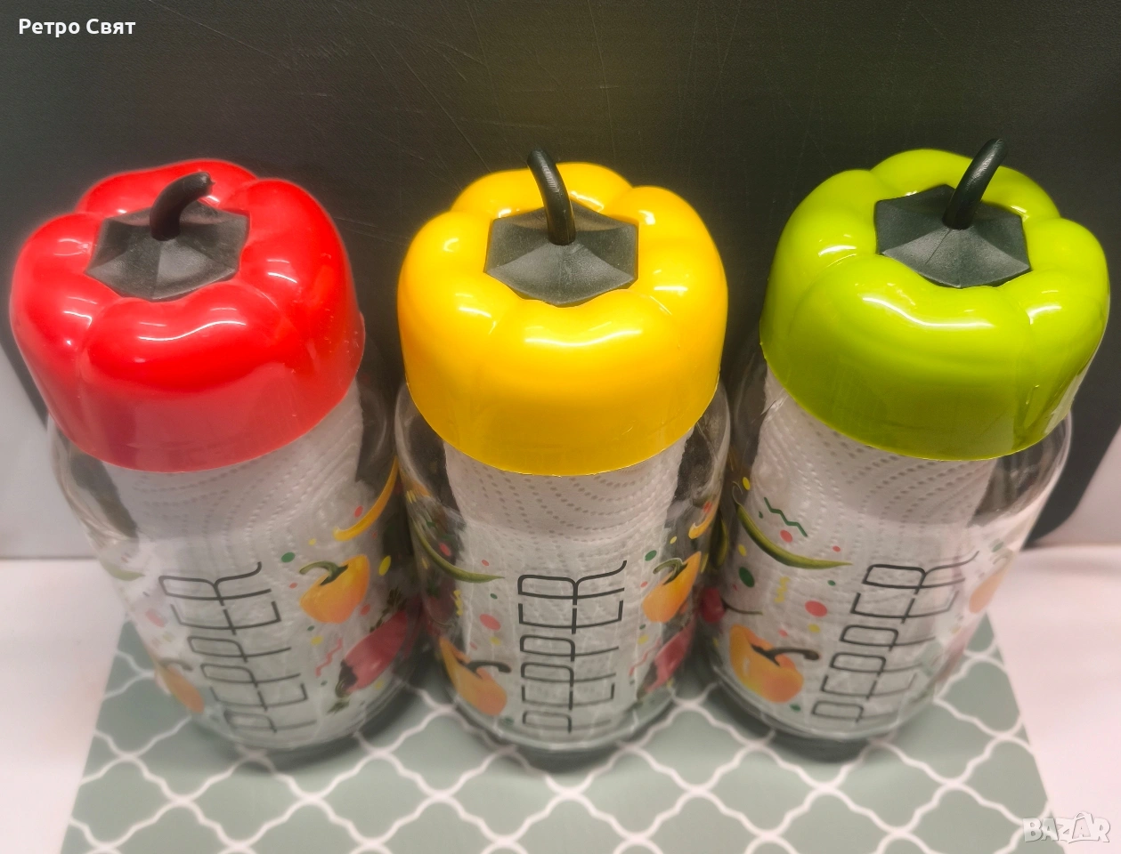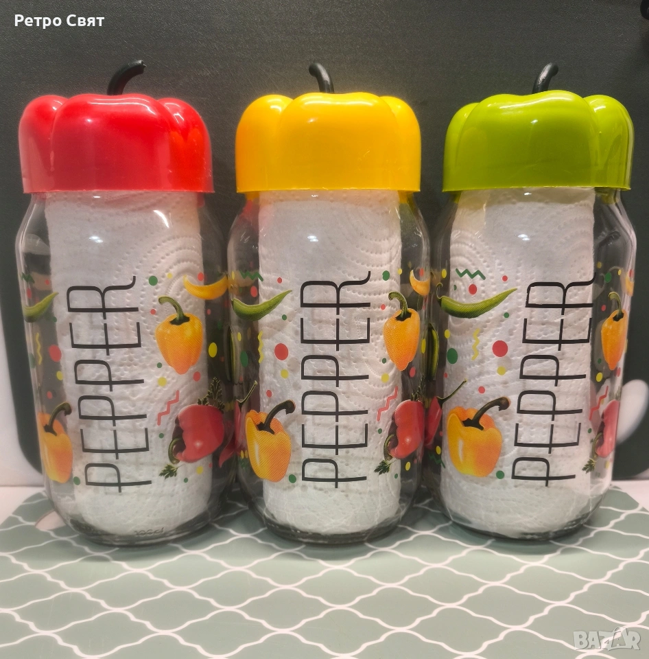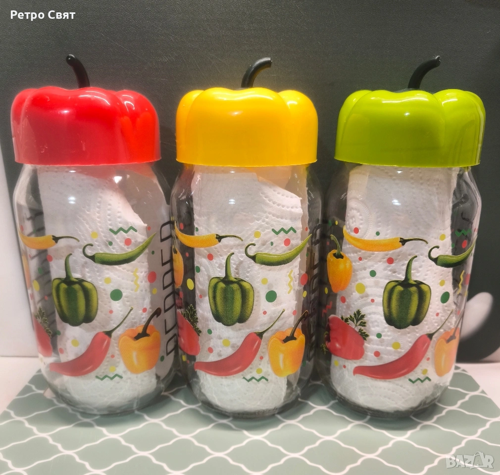 Нов и неупотребяван комплект от три големи стъклени буркани за съхранение на подправки с копирки на зеленчуци и декоративни винтови капачки във формата на пипер. 10.00€ за целия комплект. Обем - 900 ml. Един съвременен и качествен продукт с винтидж стил.