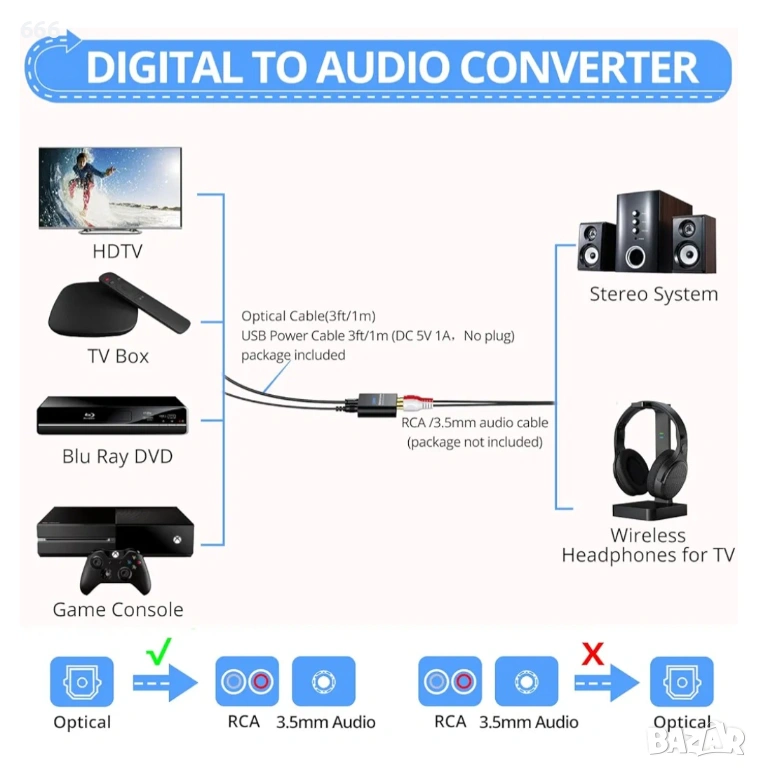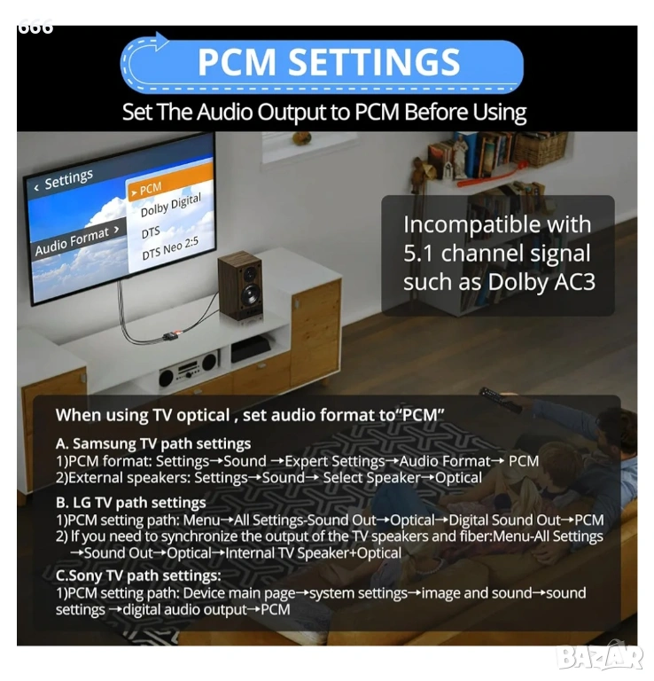 Забележка: Преди употреба се уверете, че аудио изходният формат на входното устройство е настроен на PCM. Нашият конвертор поддържа само PCM аудио, а не Dolby AC-3 или DTS 5.1 канално аудио. За телевизори Samsung: Настройки → Звук → Експертни настройки → Аудио формат → PCM. За телевизори LG: Меню → Всички настройки → Аудио изход → Оптичен → Цифров аудио изход → PCM.