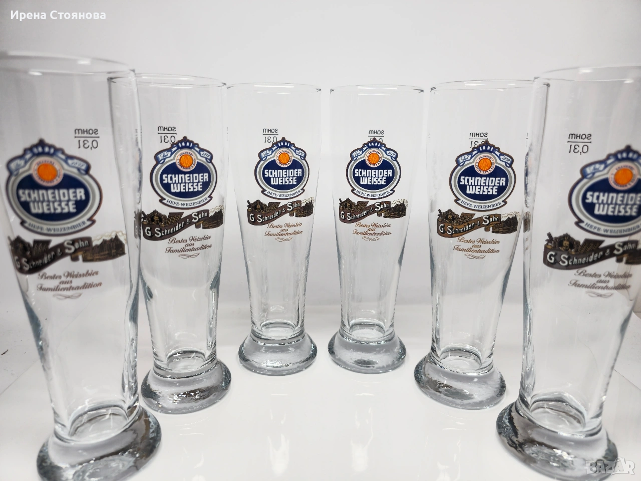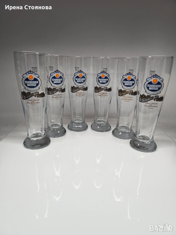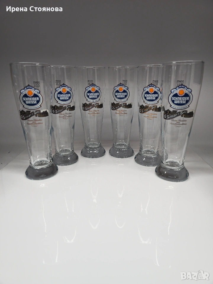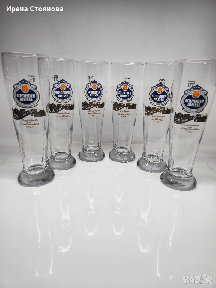 Комплект от 6 чаши за бира с вместимост 300 мл, без забележка, като нови. Това са колекционерски чаши за бира тип (Weissbier) на марката Schneider Weisse, произведени в Германия. Дизайн: Високи, стройни чаши с права форма, типични за пшенична бира, с вместимост от 0.3 литра. Маркировка: Чашите са брандирани с логото на пивоварната "G. Schneider & Sohn" и надпис "Familientradition". Употреба: Предназначени за правилно наливане и сервиране на пшенична бира, осигуряващи пространство за пяната.