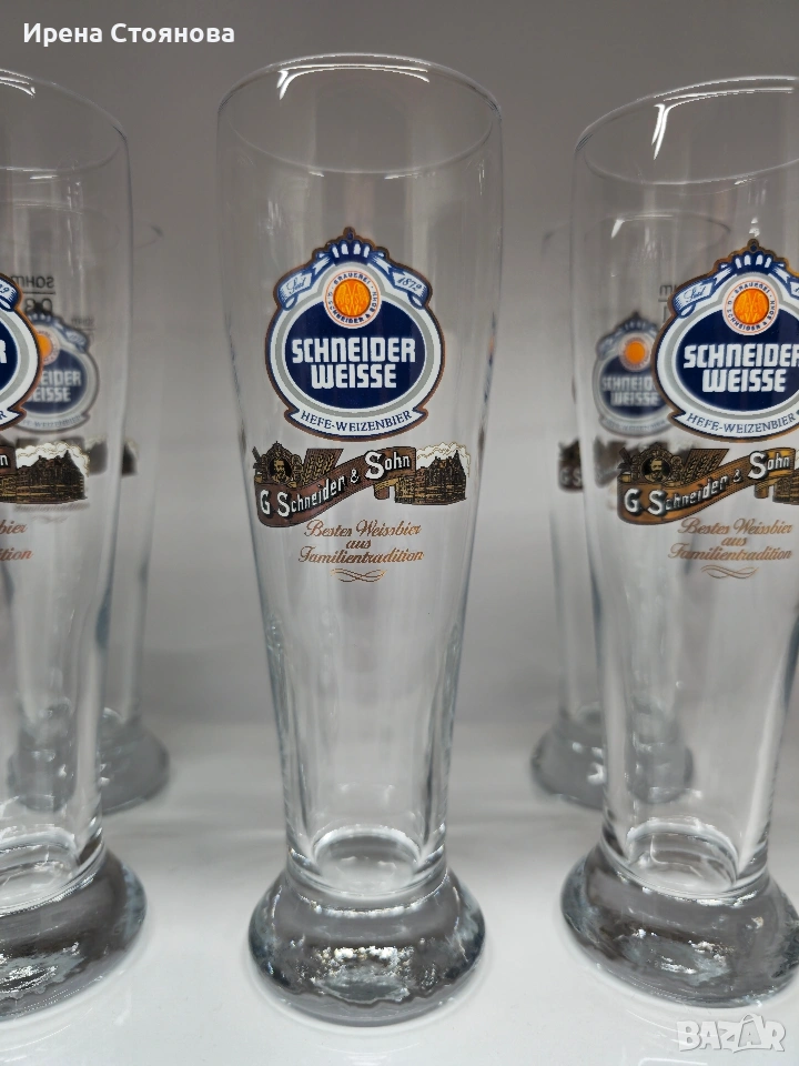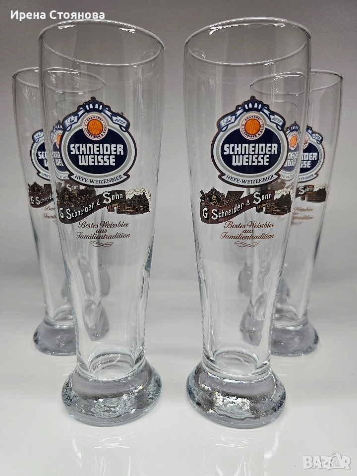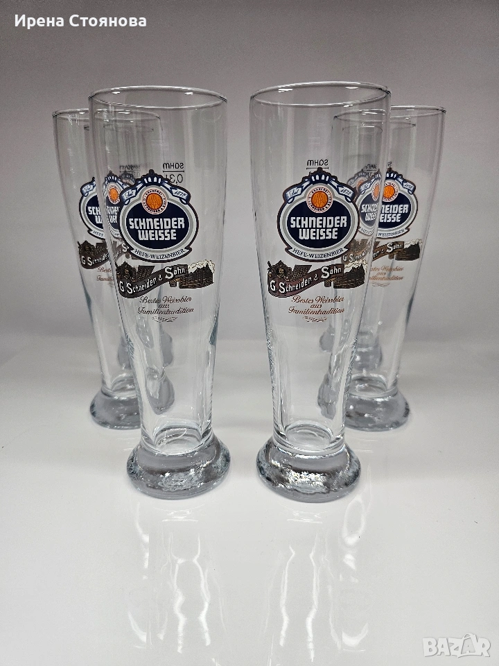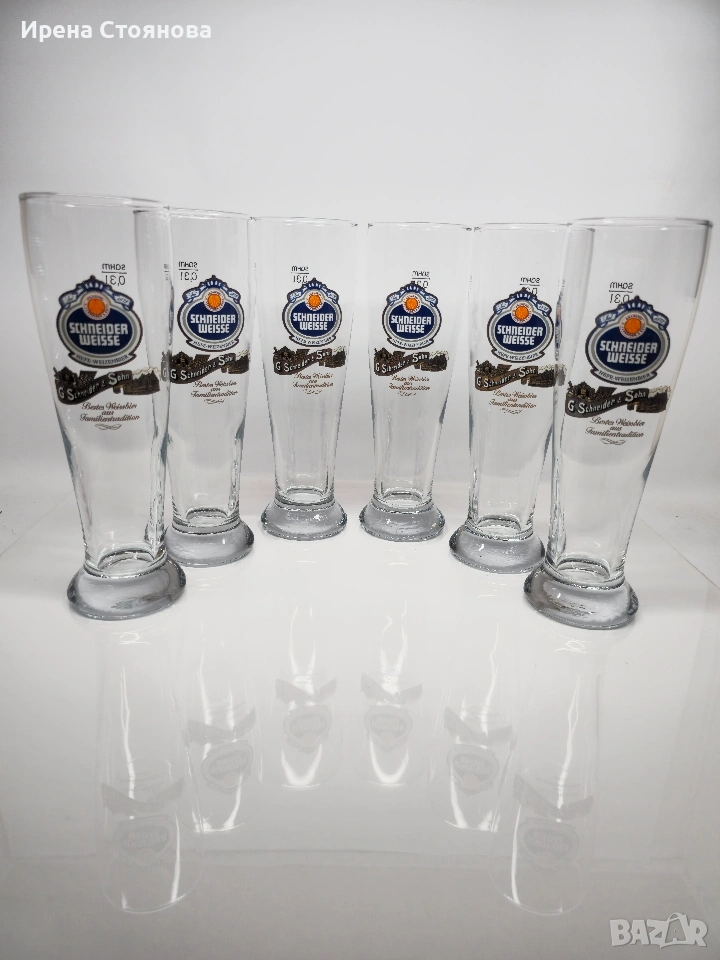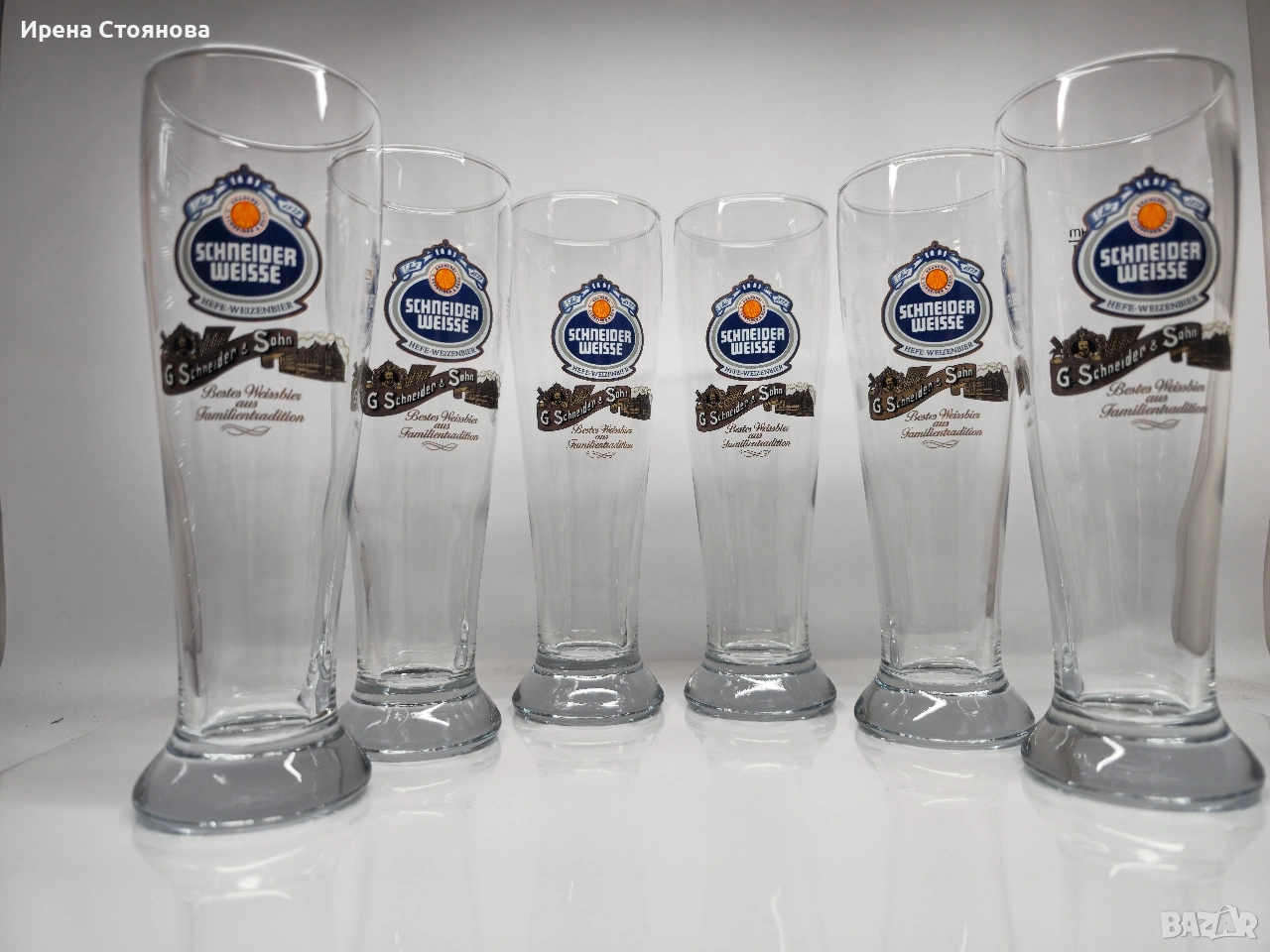 Комплект от 6 чаши за бира с вместимост 300 мл, без забележка, като нови. Това са колекционерски чаши за бира тип (Weissbier) на марката Schneider Weisse, произведени в Германия. Дизайн: Високи, стройни чаши с права форма, типични за пшенична бира, с вместимост от 0.3 литра. Маркировка: Чашите са брандирани с логото на пивоварната "G. Schneider & Sohn" и надпис "Familientradition". Употреба: Предназначени за правилно наливане и сервиране на пшенична бира, осигуряващи пространство за пяната.