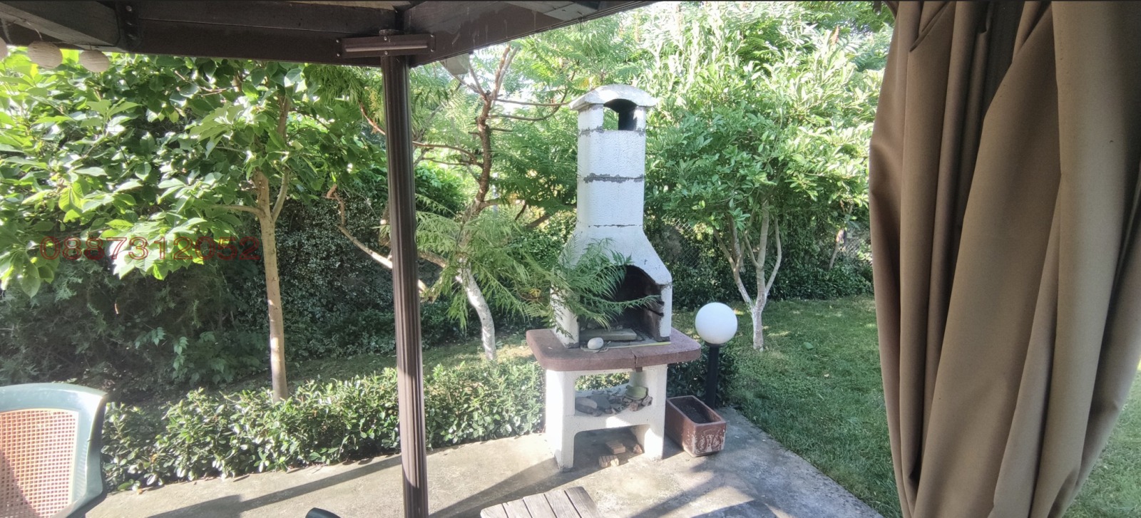 Дворът е равен, голям и отлично поддържан, с басейн с професионална филтърна система и много зеленина идеален за градина, отдих или семейни занимания. Имотът разполага и със собствен сондаж с неограничена вода, която е годна и за пиене, което осигурява пълен воден комфорт през цялата година.