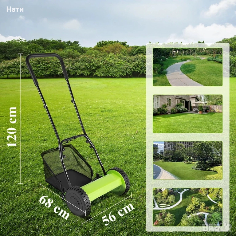 Ръчна косачка за трева с кош 40 см (16"), 5 остриета, регулируема височина 17–33 мм – Тиха, екологич → Обява 54023536