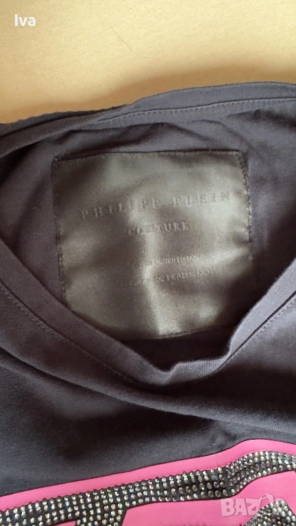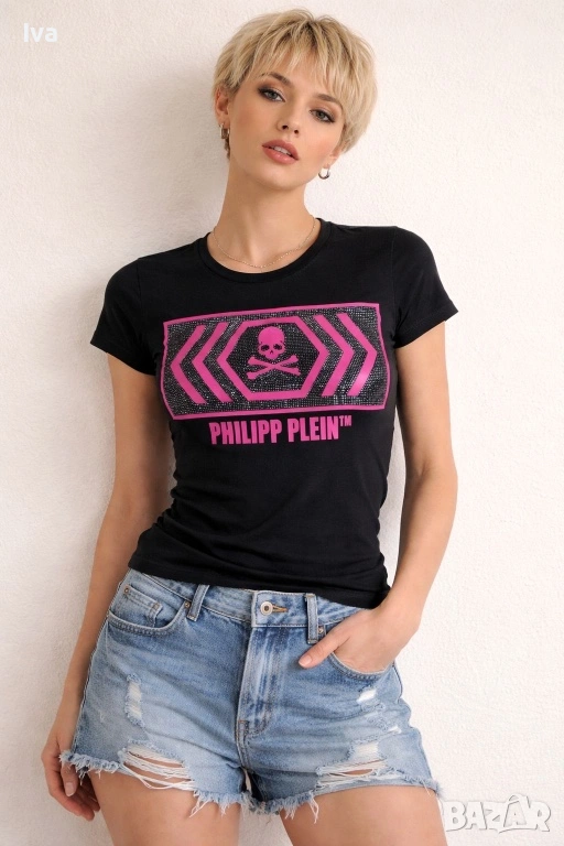 Предлагам оригинална дамска тениска Филип Плейн в черен цвят с ефектен розов принт и декоративни камъни. Моделът е с емблематичното лого с череп, което придава характерен и разпознаваем стил на марката.