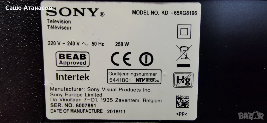SONY KD-65XG8196 с счупена матрица, 100611111 ,1-982-454-51 ,47-6021248 ,1-458-998-12 ,1-983-004-12