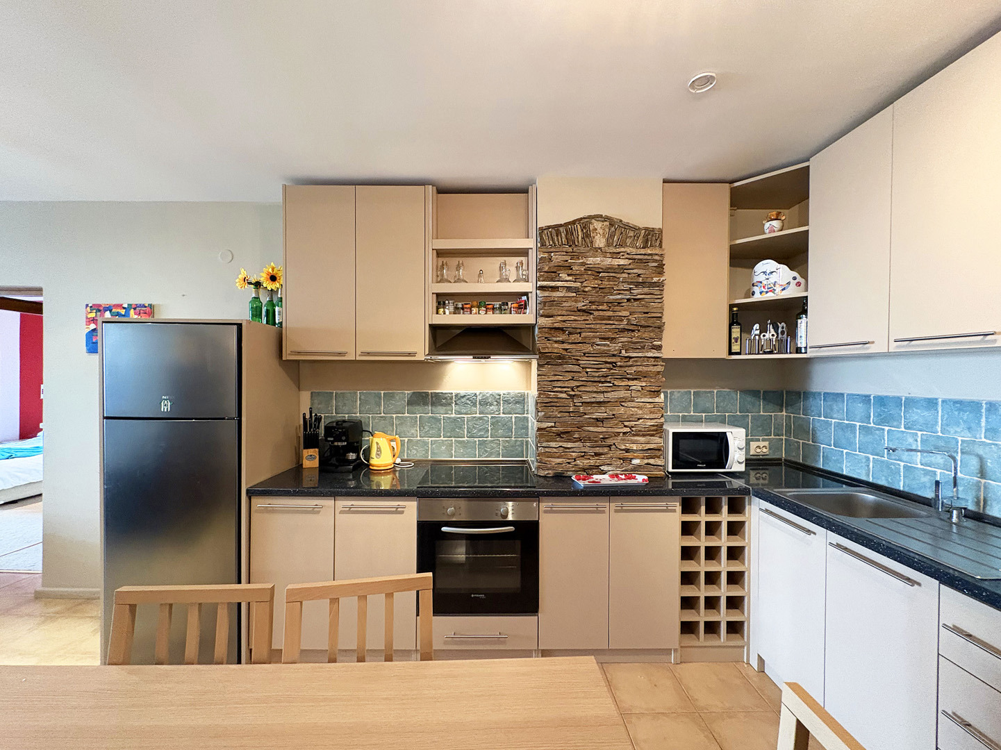 Кухненския кът е оборудван с горни и долни пкафове, котлони, фурна, хладилник и абсорбатор. Има трапезна маса с шест стола.