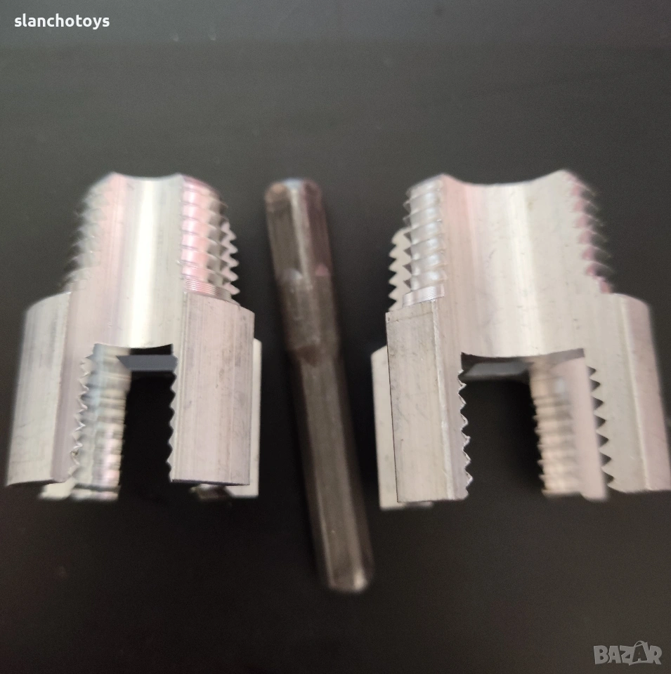 Комплект инструменти за нарязване на вътрешна и външна резба на ПВЦ тръби, 1/2 и1/3. Изработени са от стомана. Поставят се на дрелка и така се нарязва тръбата. Може и ръчна тресчотка. Продават се комплект или по отделно ,всяко за 6€. Изпращам с Еконт или лично за Сф..