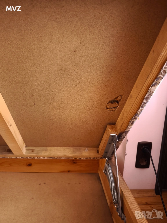Леглото е ползвано около 12 г от дъщеря ми. В добро състояние на конструкцията и механизма. Доста скачаше като малка върху него. Вижте снимките за да се ориентирате с пораженията и размерите.