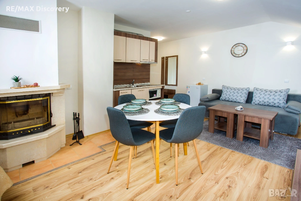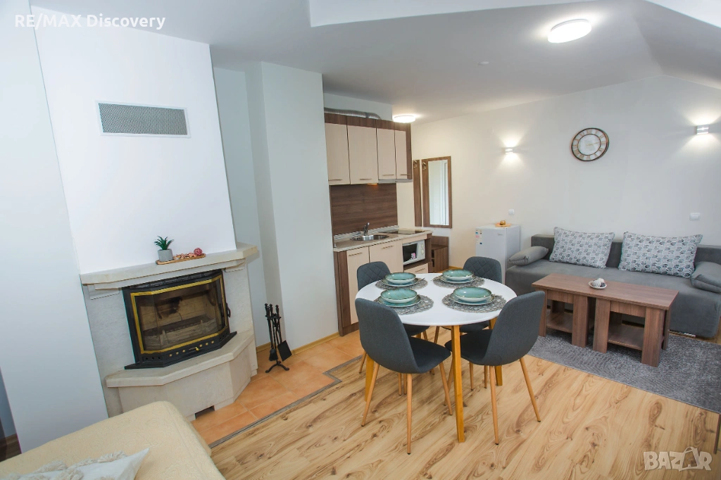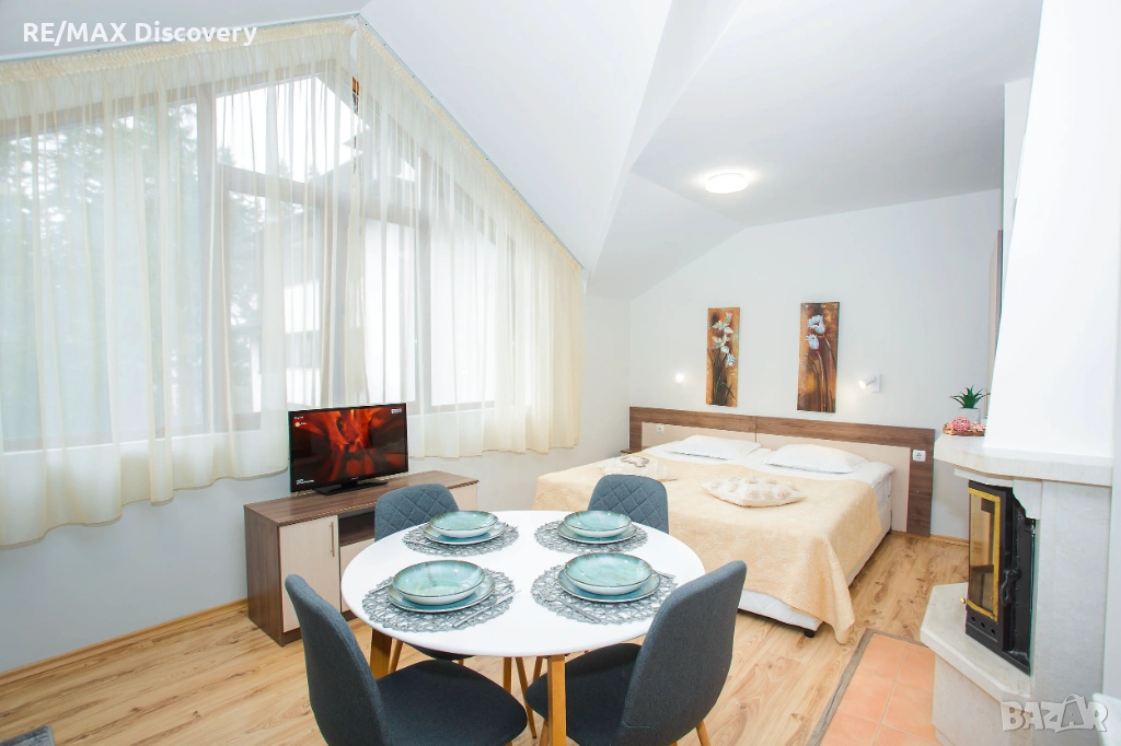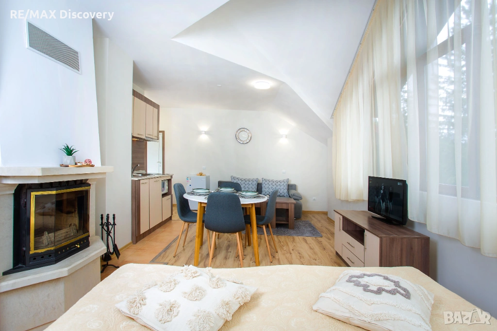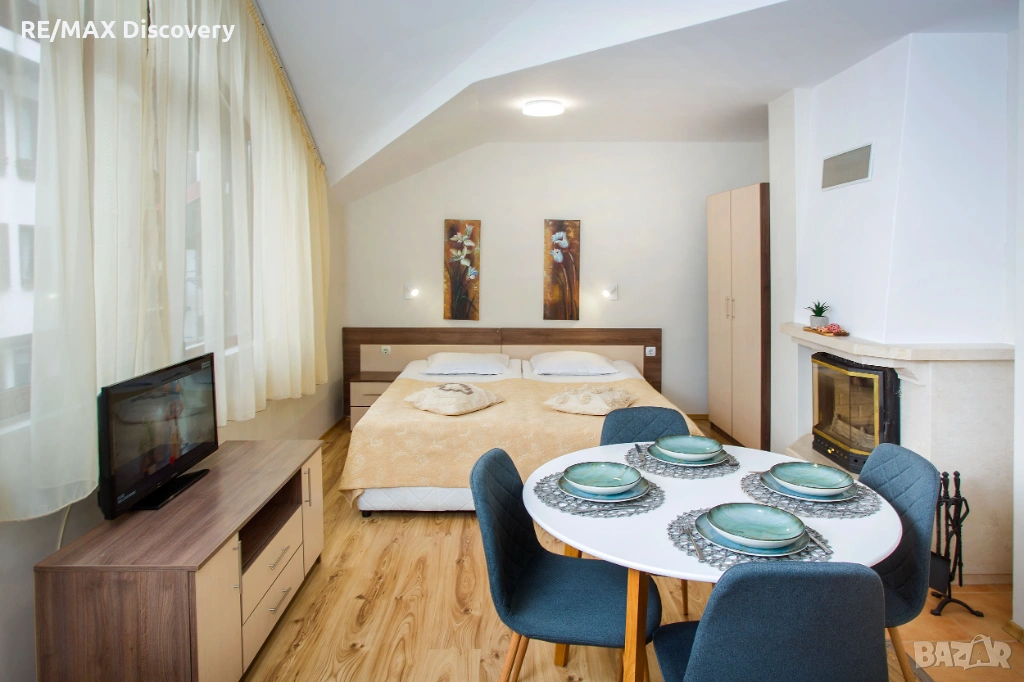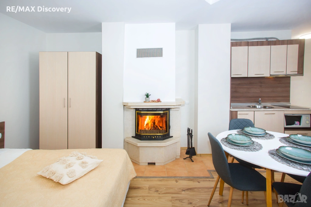 * Студиото включва - стая със спалня, кът с мека мебел, камина, кухненски бокс и място за хранене.