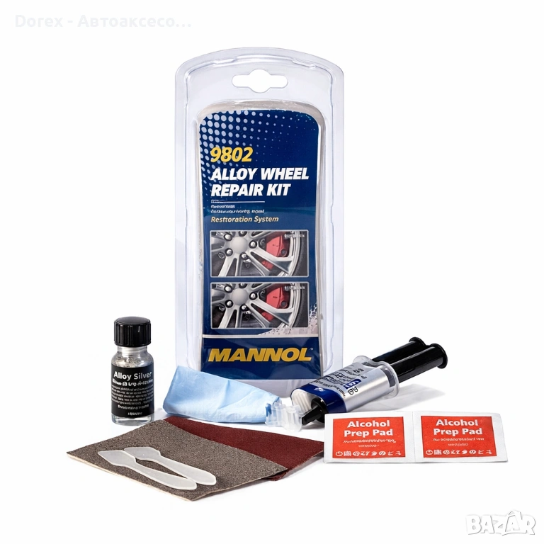 MANNOL Alloy Wheel Repair Kit е комплект за ремонт на алуминиеви джанти - професионален комплект, предназначен специално за ремонт на алуминиеви джанти, изработени от алуминиеви и магнезиеви сплави, но е подходящ и за ремонт на всякакви лети, ковани, щамповани и композитни автомобилни джанти, както от леки сплави, така и от стомана, както и за дискове и джанти, изработени от пластмаса. Подходящ за ремонт на декоративни капачки и всякакви други части, изработени от подобни материали.