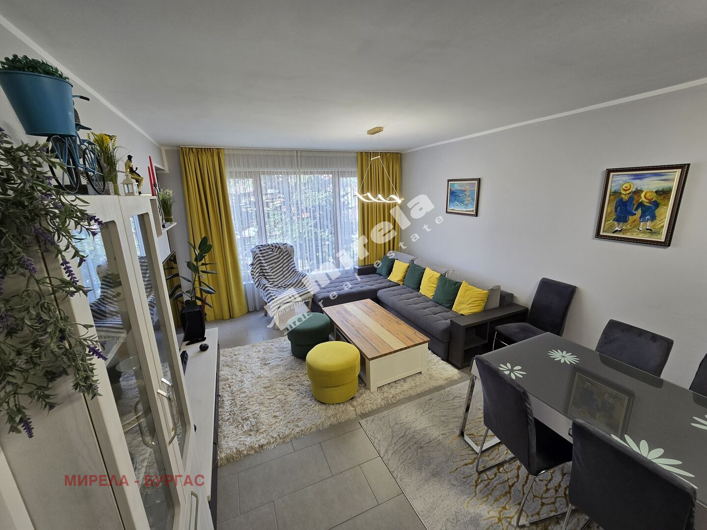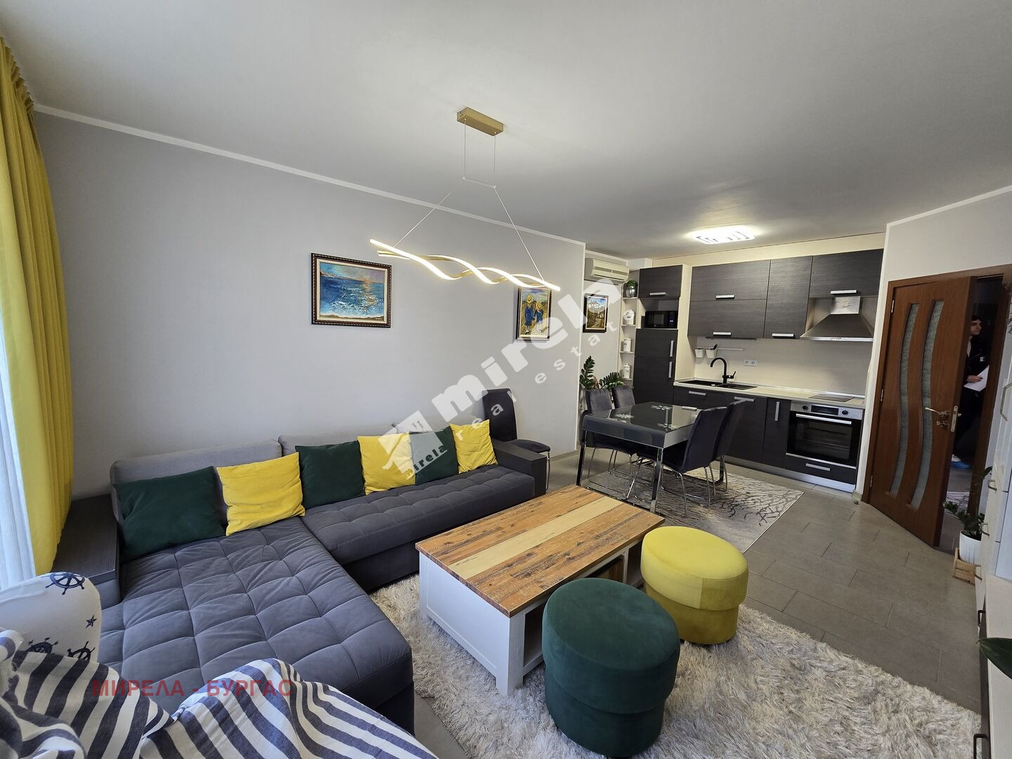 Оборудван с мебели и висок клас ел.уреди, климатици във всяка стая, пералня и сушилня в мокрото помещение, телевизори, вградени съдомиялна и хладилник в кухнята, фурна, котлони и аспиратор.