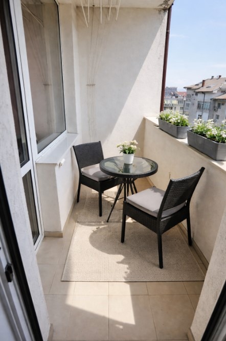 Имотът е обзаведен, с площ 55 кв.м, на 6-ти от 7 етажа в сграда с асансьор. Разпределението включва входно антре, хол с кухня и трапезария, спалня, баня с тоалетна и тераса.