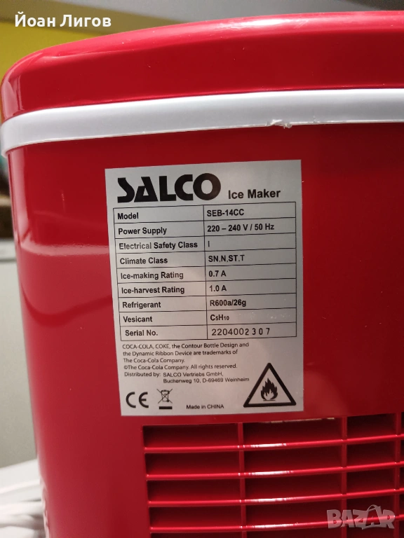 Продавам машина за лед Salco в много добро работно състояние. Стилен модел с Coca-Cola дизайн, подходящ за дома, партита или заведения.