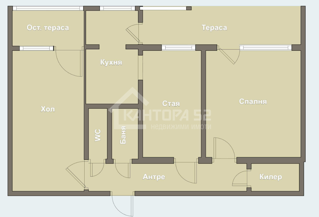Апартаментът е с функционално разпределение: коридор, просторен хол с остъклена тераса, две спални, кухненски бокс с усвоена тераса, килер, баня и тоалетна в отделни помещения.