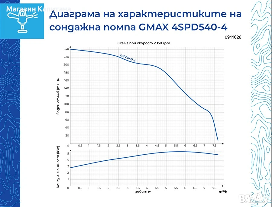 Сондажна помпа Gmax 4SPD с неръжд. турбина 7,5м3, 170м. дълб. 250м. вод. стълб