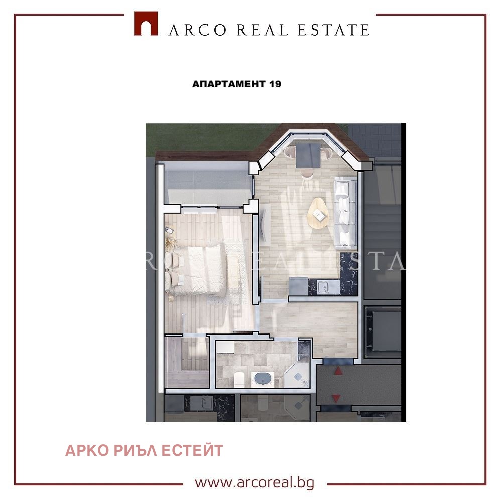 Разпределение: Входно антре, дневна с кухненнски бокс / 17.20 кв.м./, спалня / 11.97 кв.м./, баня с тоалетна / 4.37кв.м./, тераса.