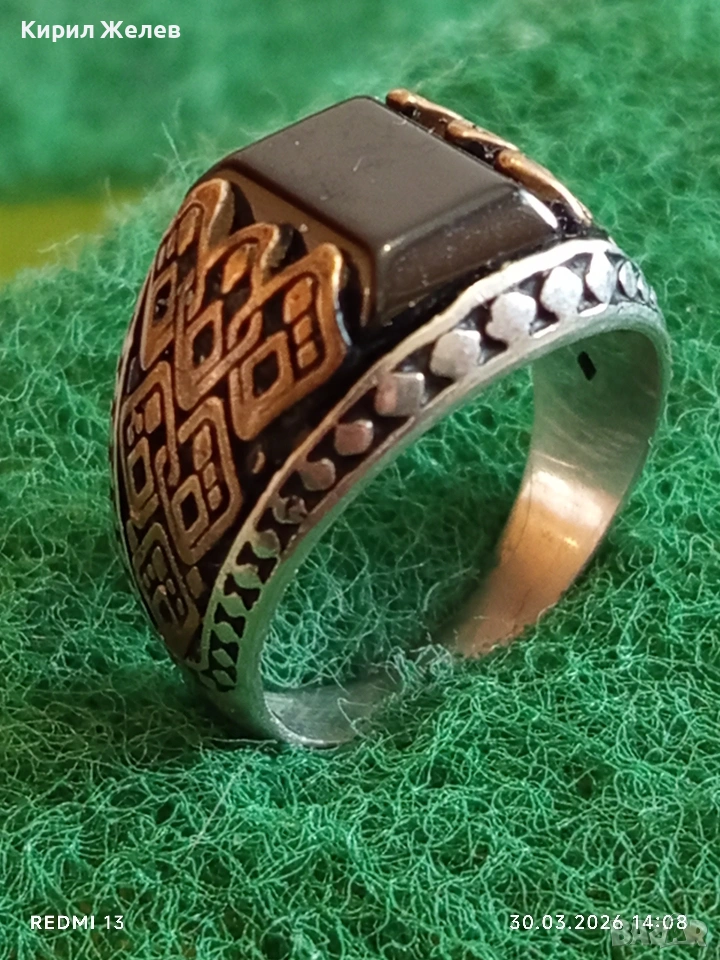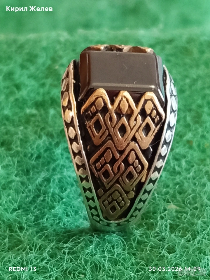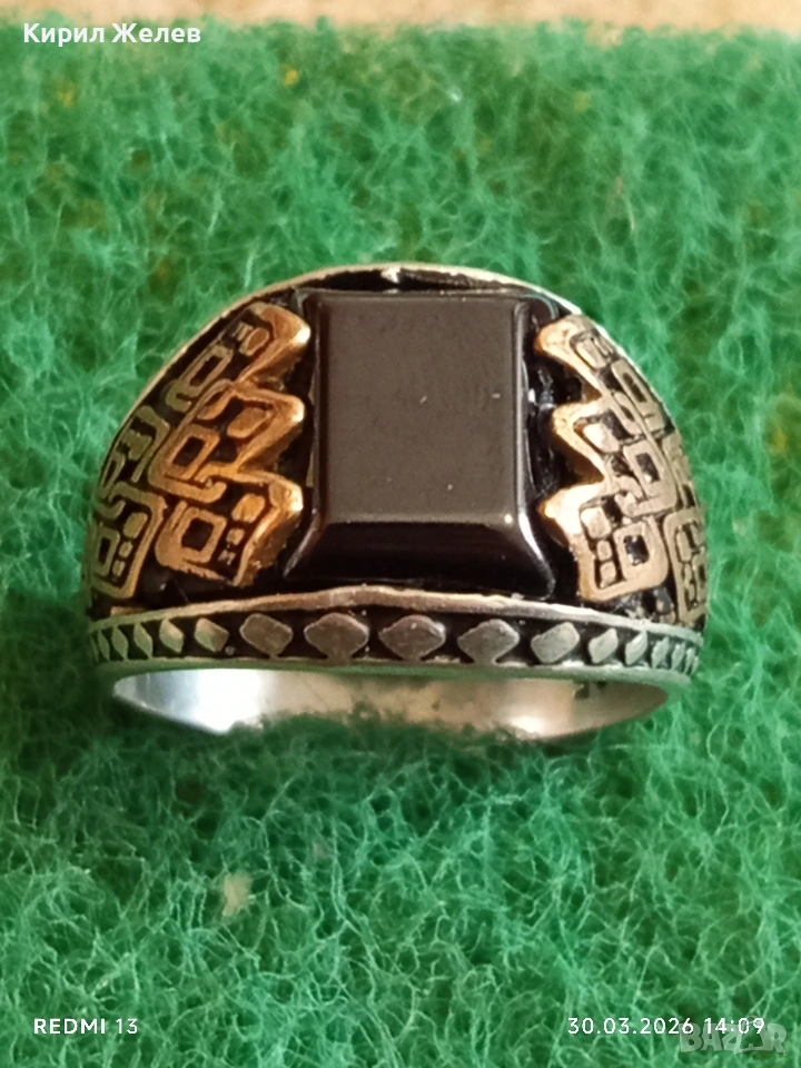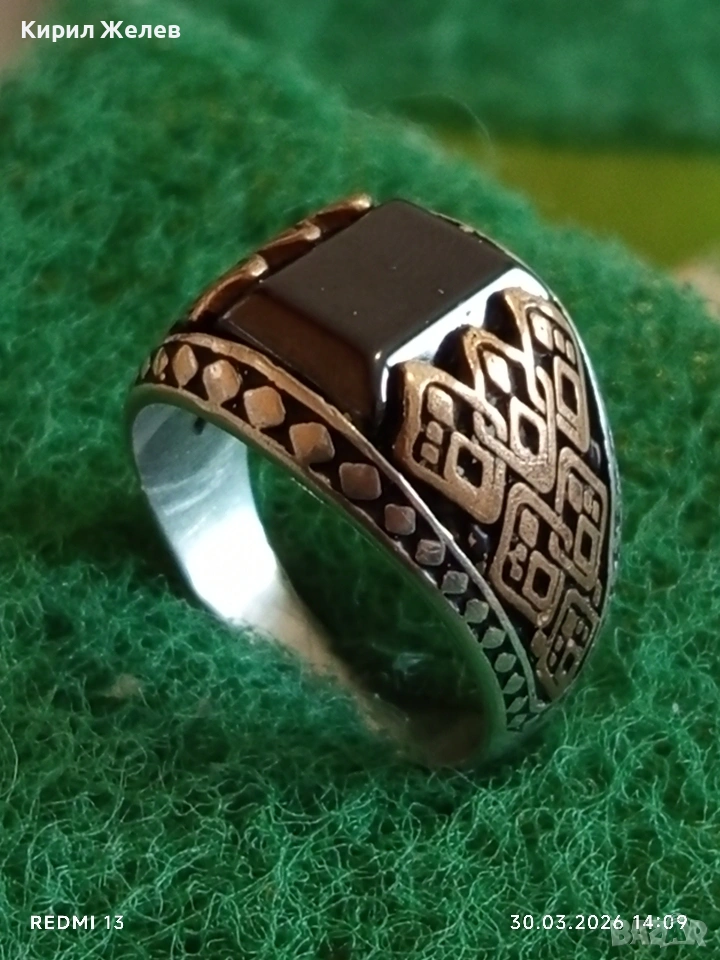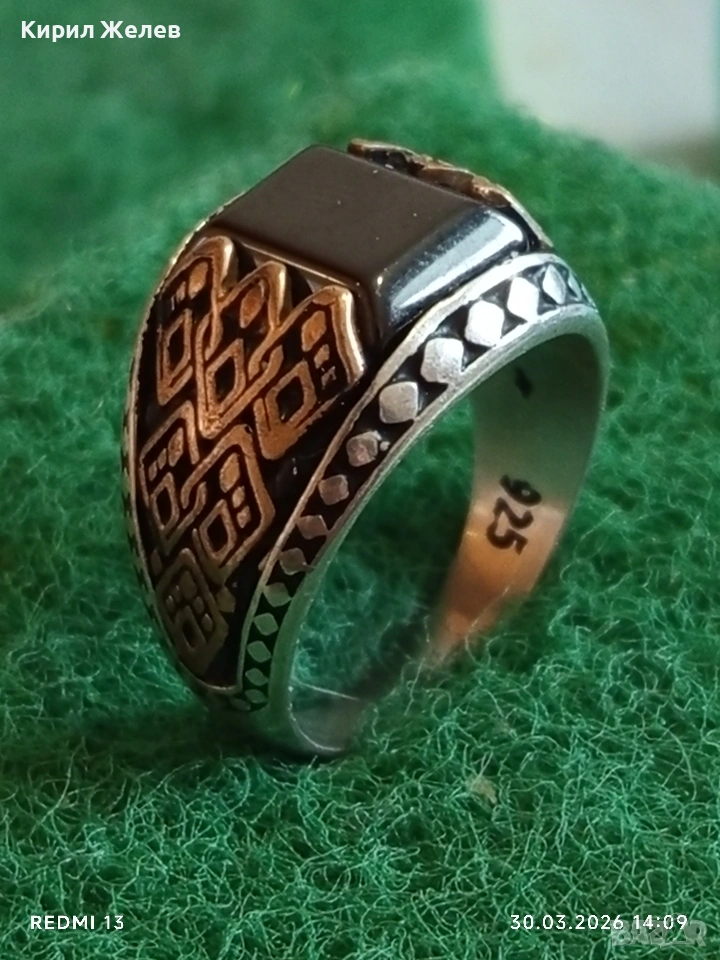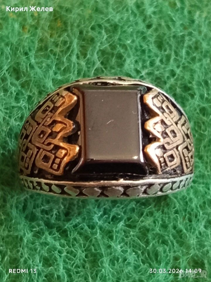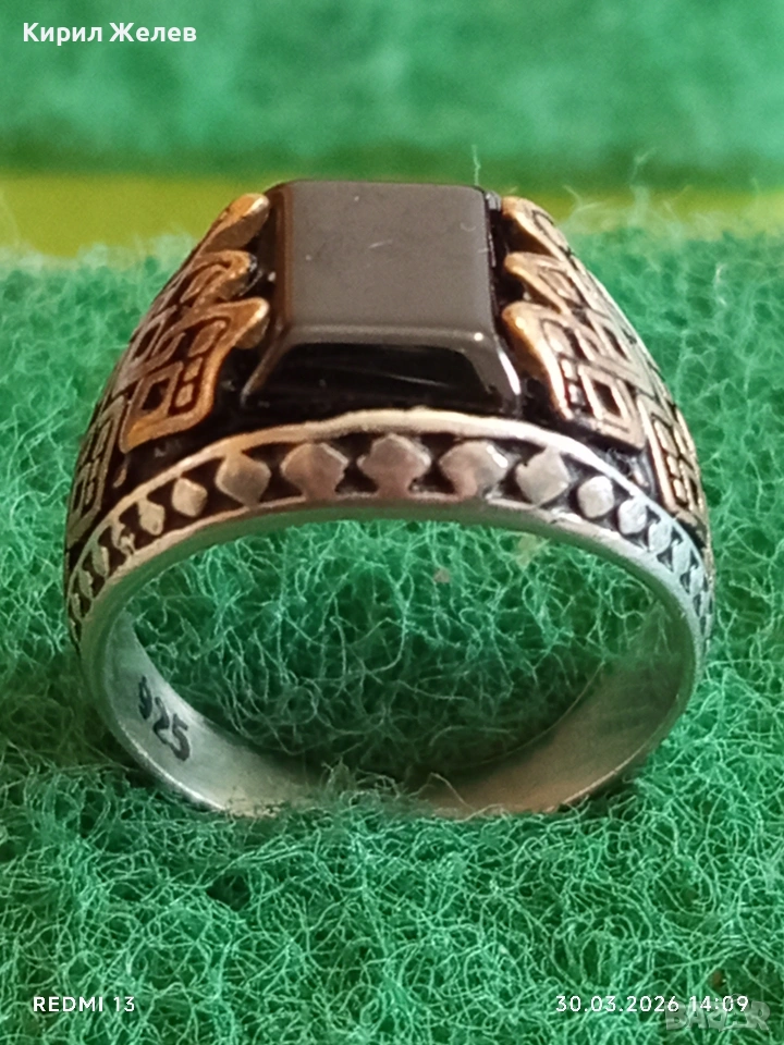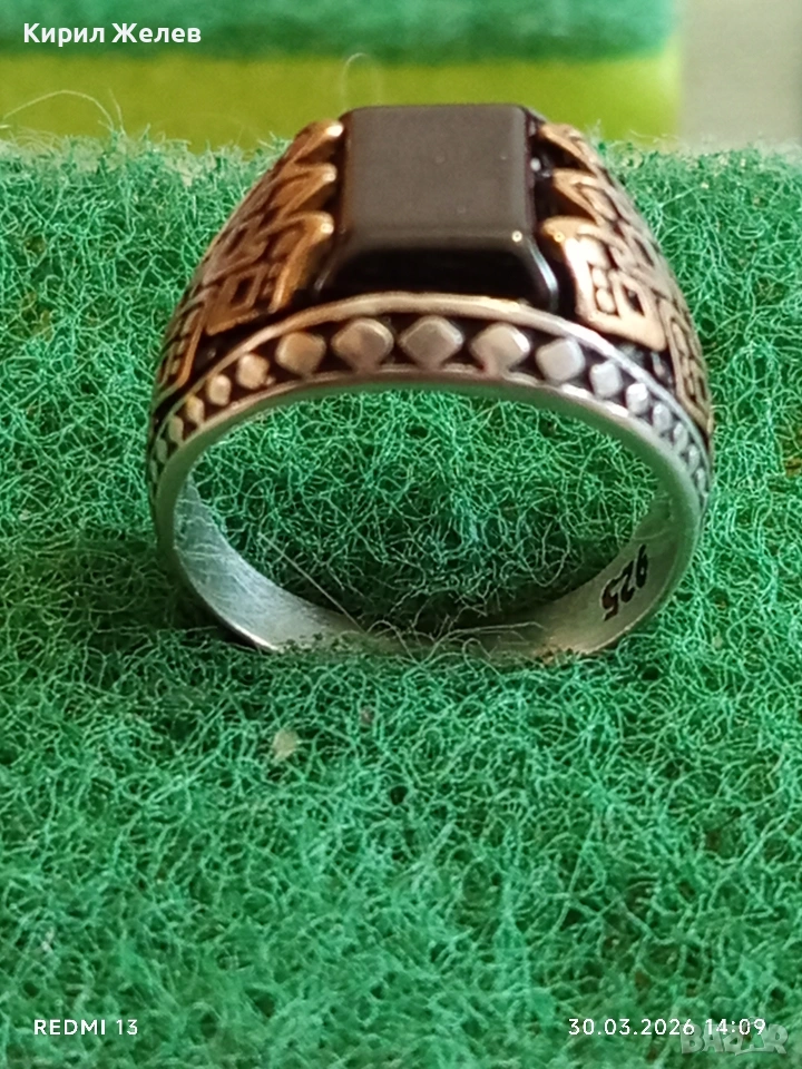 Мъжки сребърен пръстен инкрустиран с камък черен ТУРМАЛИН странична орнаментика 41533