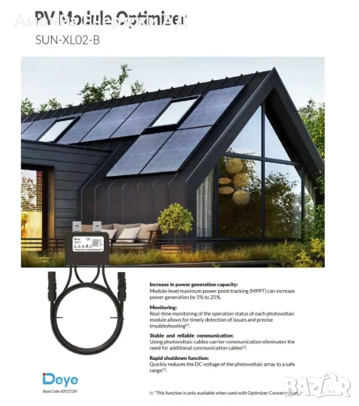 Deye SUN-XL02-A е модулен оптимизатор, предназначен за свързване към един соларен панел, с цел максимизиране на енергийния добив и подобряване на производителността при небалансирано осветяване, засенчване или разлики в ориентацията. Работи съвместно с инвертори Deye, позволявайки индивидуален MPPT контрол на всеки панел или двойка панели, подобрявайки сигурността и ефективността на системата.