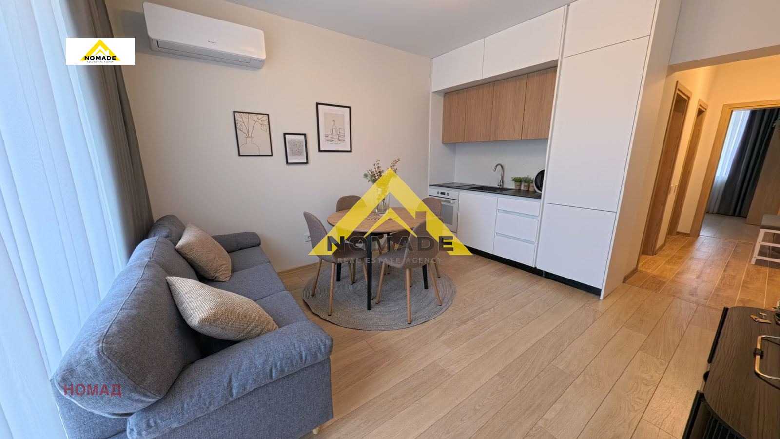 стилна дневна с трапезария и напълно оборудвана кухня с вградени електроуреди, включително хладилник, фурна, котлони, аспиратор
