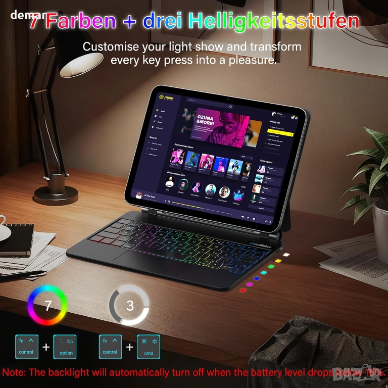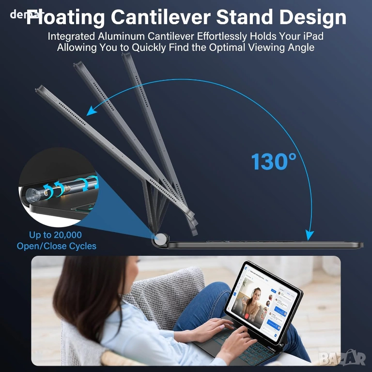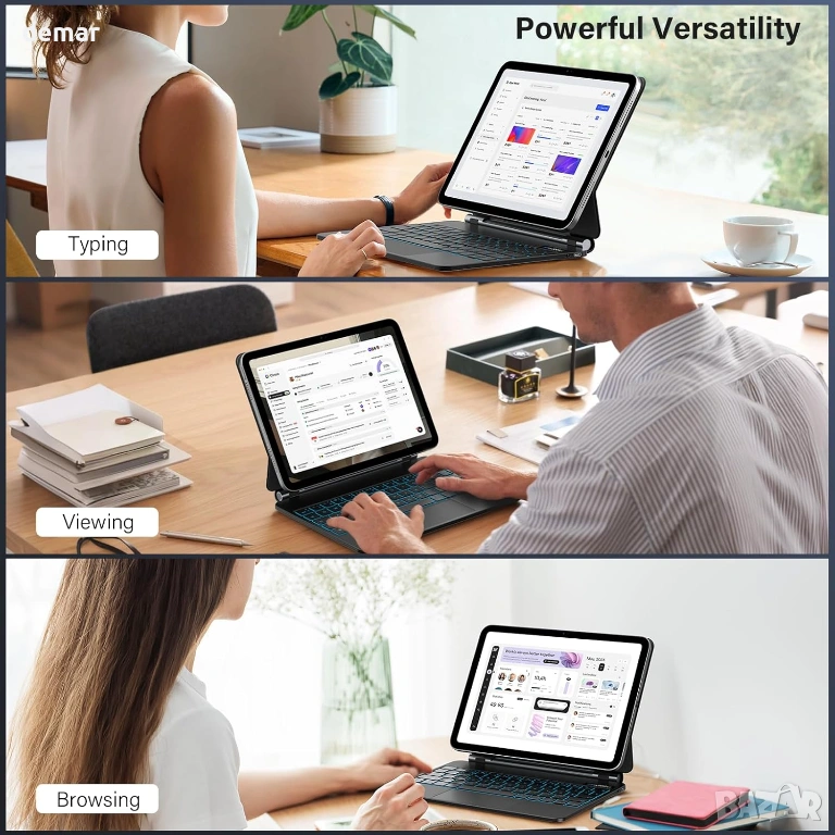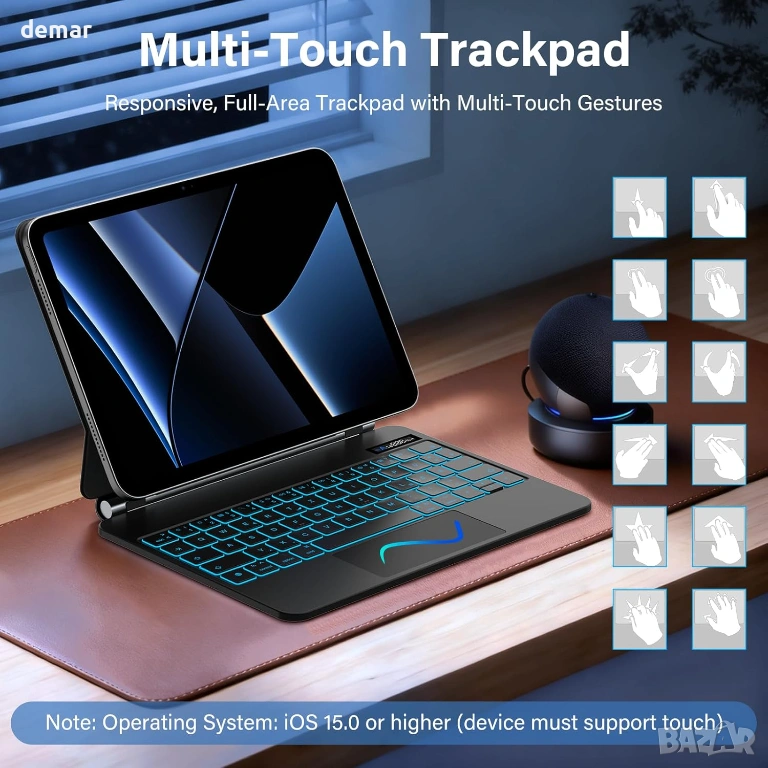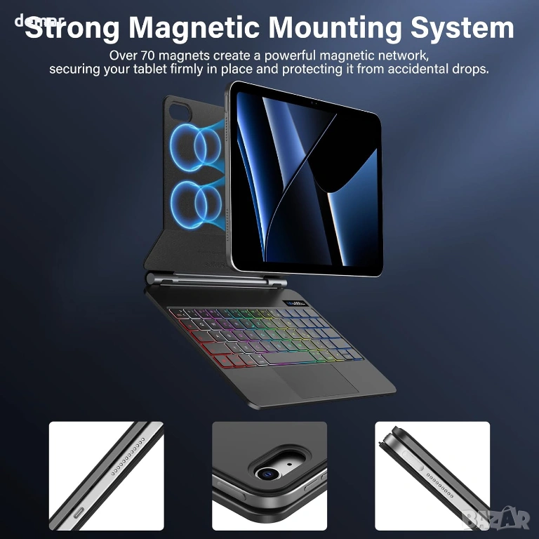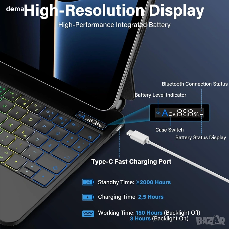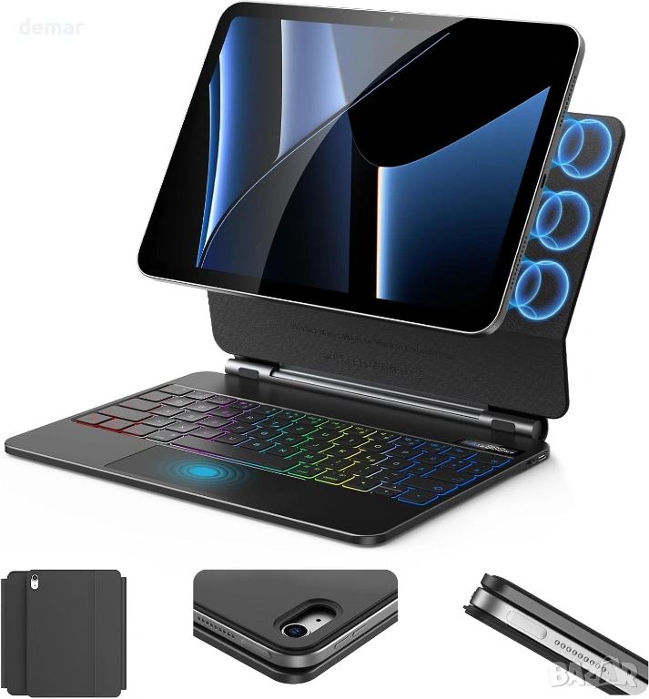 Проектиран специално за моделите iPad от 10-то (A2696, A2757, A2777) и 11-то (A3384, A3355, A3356) поколение, този калъф с клавиатура осигурява прецизно прилягане и надеждна работа, като същевременно е с магнитен плаващ дизайн, който позволява регулируеми ъгли на видимост за комфортна употреба. Той включва вграден мултитъч тракпад за плавна навигация и ефективно многозадачност, осигурявайки изживяване, подобно на лаптоп. Клавиатурата с подсветка предлага седем цветови опции с регулируема яркост и отзивчиви клавиши за тихо и точно писане, заедно с удобни функции за бърз достъп за подобряване на производителността. Дълготрайната батерия поддържа продължителна употреба с функции за пестене на енергия и ясни LED индикатори за актуализации на състоянието, докато силната магнитна структура осигурява пълна защита и лесен достъп до всички портове, което го прави практичен за ежедневна употреба в движение.