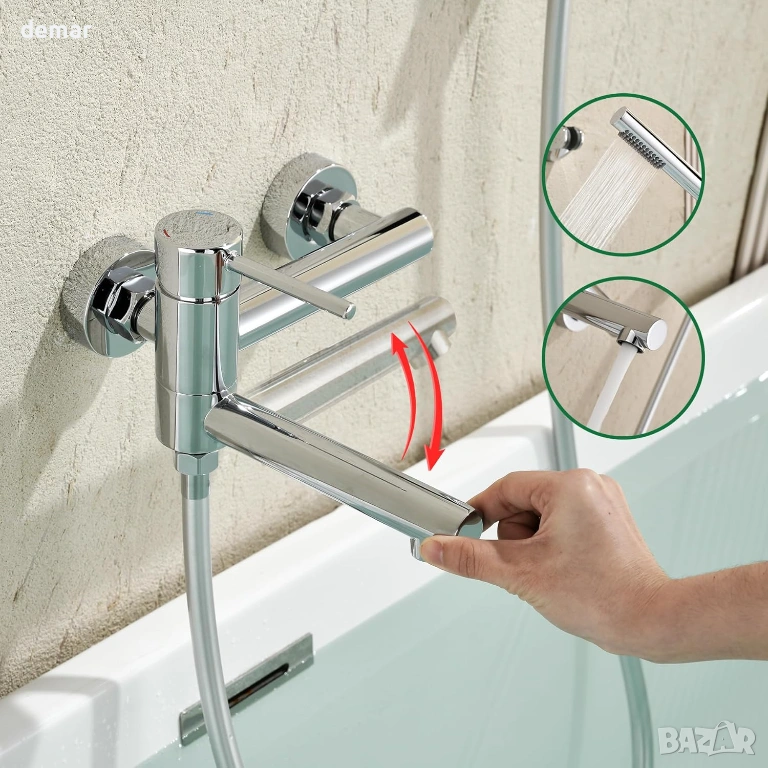 Стенен смесител за вана/душ за открит монтаж, 2-функционален, с въртящ се чучур, хром