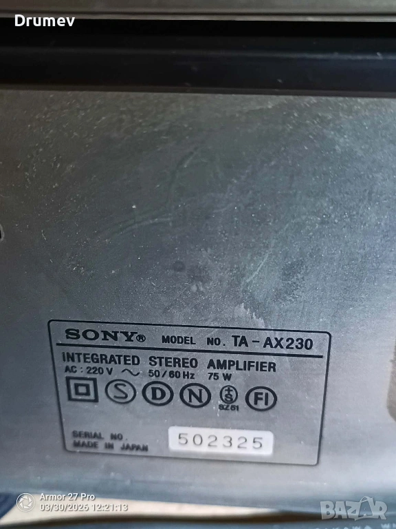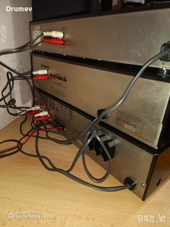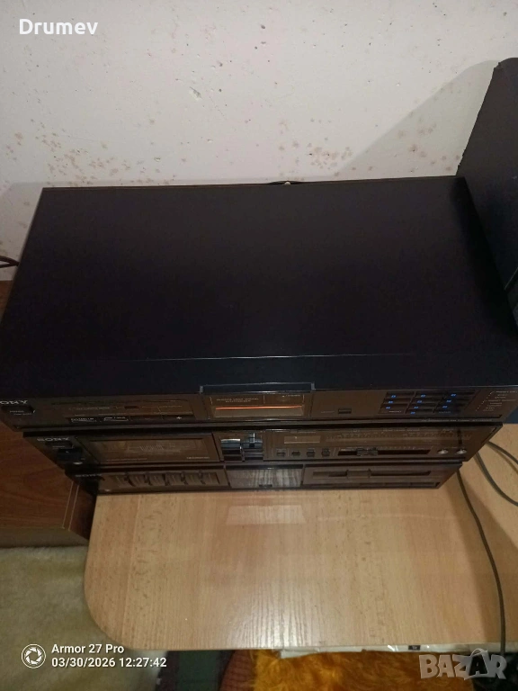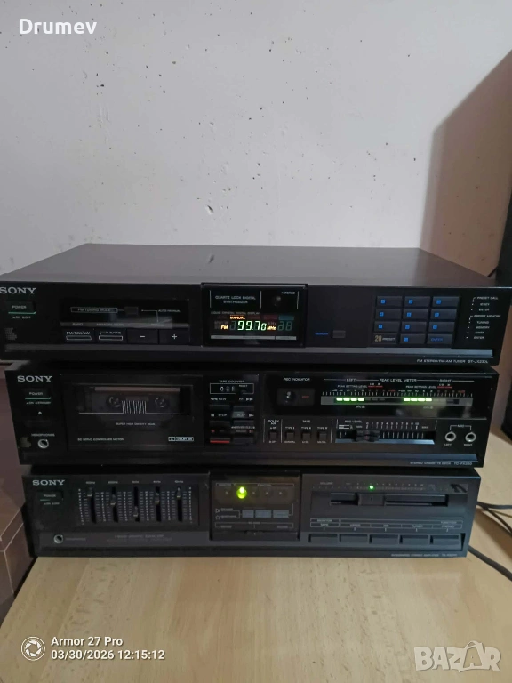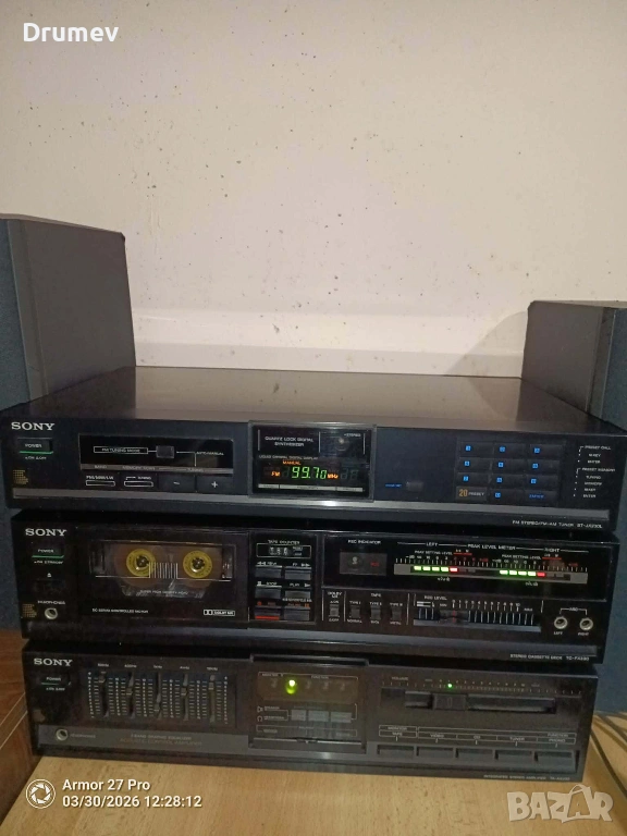 Продавам три броя декове от система на SONY - тунер,касетъчен дек,и усилвател с 5 еквилайзера.Изходяща мощност 30вата при 8Ω.Всички функции и бутони работят.Има някои козметични забележки по външния вид,видни от снимките.По касетъчния дек всичко функционира, свири,превърта и в двете посоки,единствена забележка е,че се чува съвсем леко механиката.Тунера търси и ръчно и автоматично станции,като ги запаметява на 20позиции.Усилвателя свири и работи много приятно,еквилайзерите функционират, без излишни шумове,пръщене,и други отклонения.Към системата могат да се добавят тонколони,отговарящи по параметри за модела,които се продават отделно,в друга моя обява!При комплектоване,цената ще бъде - 170€!